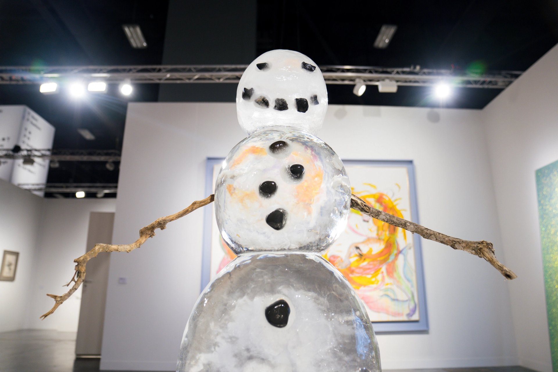 This frosty fellow was first created for the 1995 outdoor exhibition Ripple Across the Water in the city centre of Aoyama, Japan. Every day just before lunch, a refrigerated truck delivered the snowman ice sculpture to a private park and it slowly melted away, to be replaced the next day. The stone buttons and eyes and the tree-branch arms embedded in the ice slowly fall off as it melts. At the fair, the work is being replaced every two days. Turns out this melting man is destined to remain in sunny climes—it sold to a Middle East institution for an undisclosed sum. Best keep the air con on.