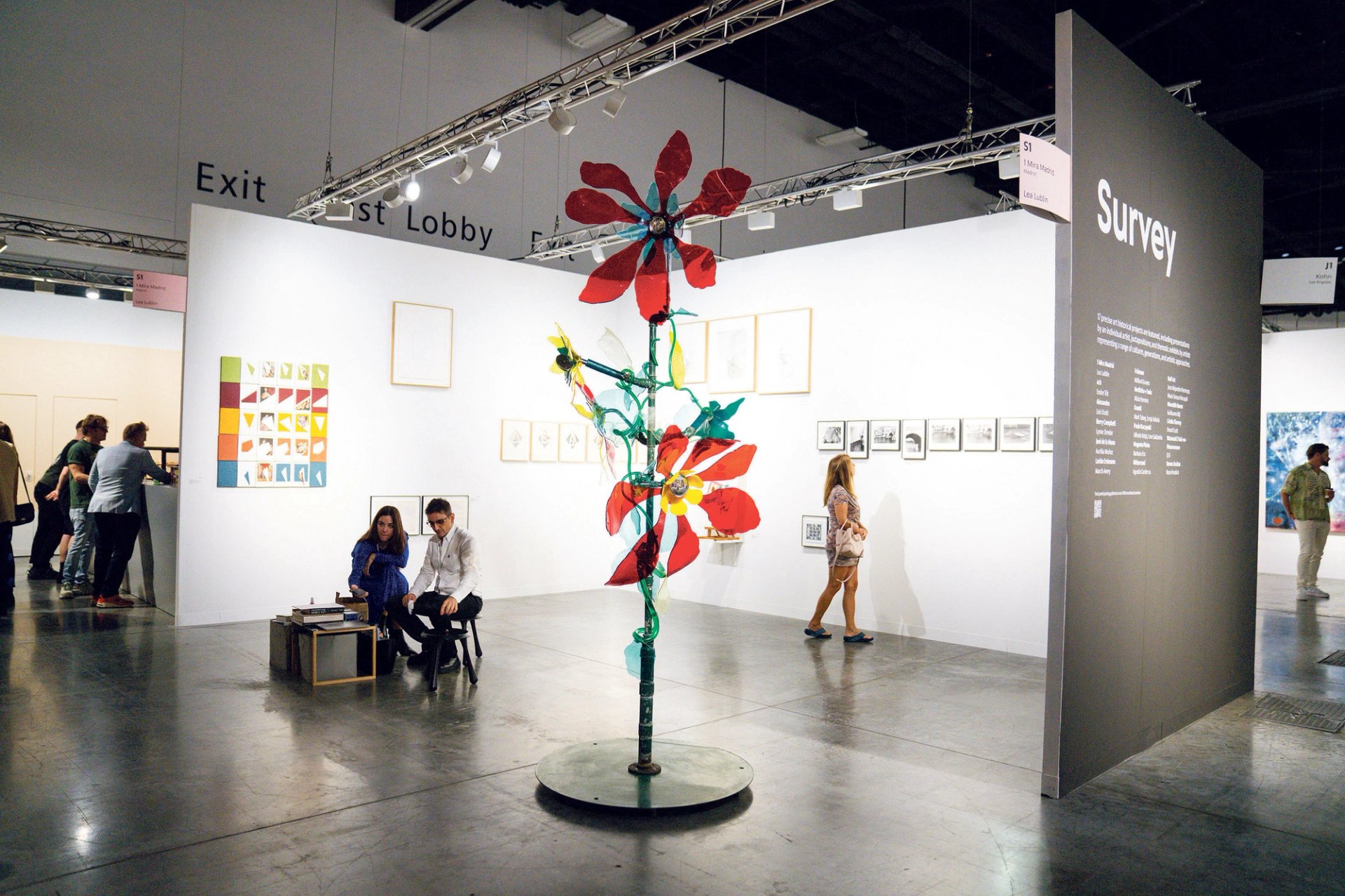 The Venezuelan-born, Berlin-based artist Calero creates complete environments that critique stereotypical images of the Caribbean—loud, bright, and brash. The paintings at Art Basel are part of these larger installations. “They are like a souvenir of the environments,” Hakel says.