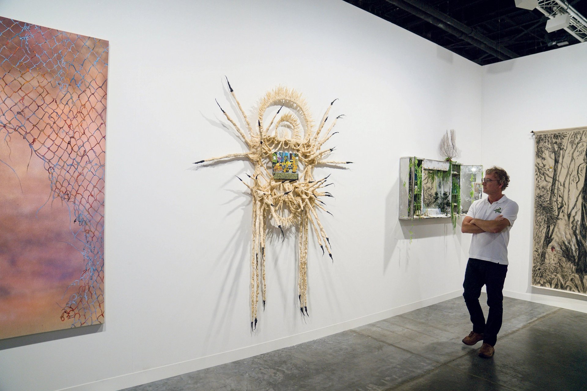 Maravilla’s ritualistic sculptures and drawings often draw on the journey he made as a child from El Salvador to the US with his undocumented father. “So there is a deep narrative and reflection about what that kind of displacement means,” Hakel says. The altar-like installations he creates using a specially made fibre embedded with sharks’ teeth, with a small votive painting in the centre, were influenced by Maravilla’s experience of surviving cancer.