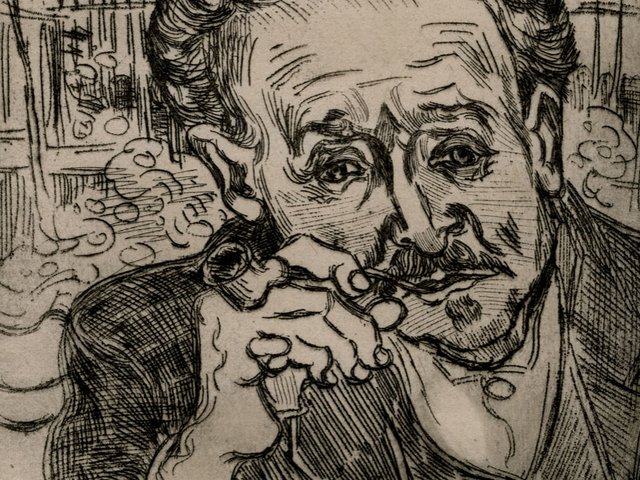 Gachet’s son (1873-1962), also named Paul, later recalled how the etching had come about: “After an outdoor lunch in the courtyard, once the men’s pipes were lit, Vincent was handed an etching needle and a varnished copper; he enthusiastically took his new friend as the subject.”