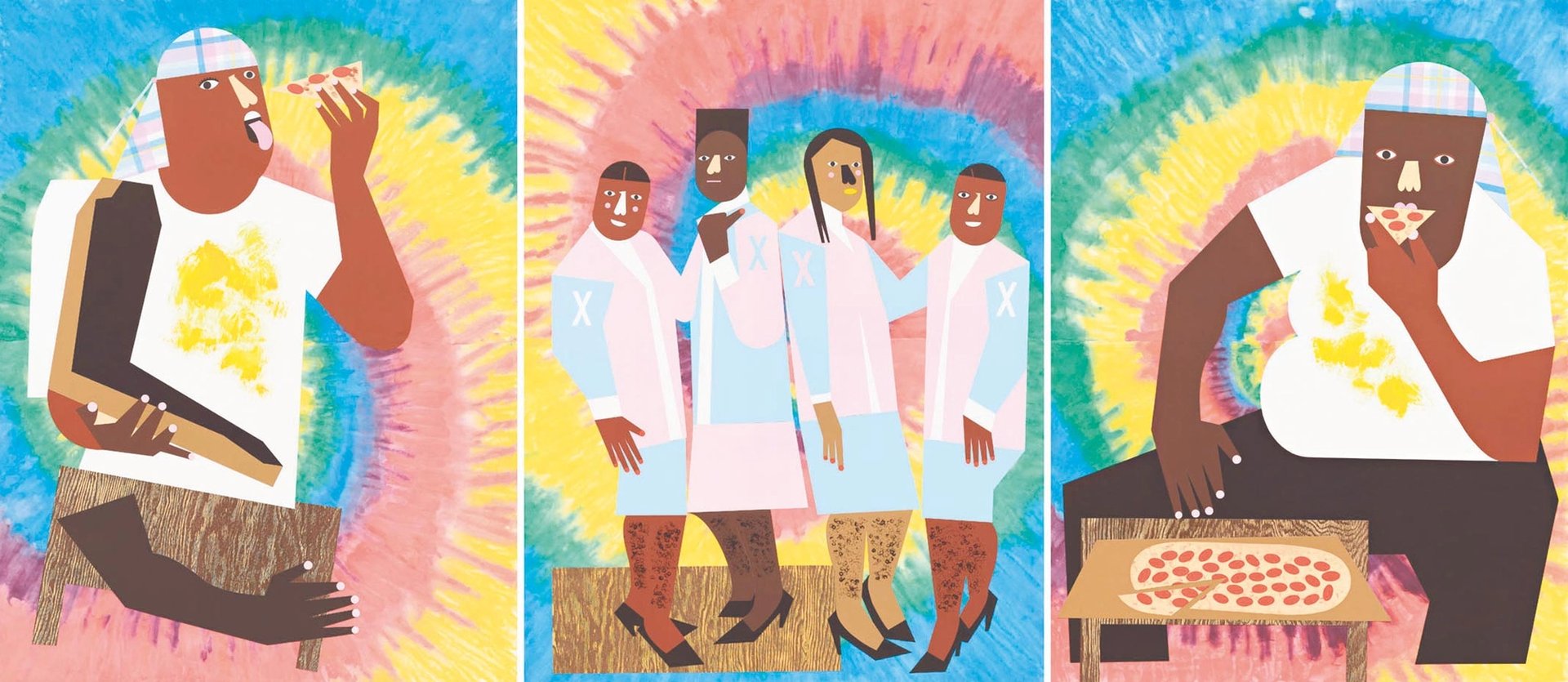 Abney’s What I Wanted vs. What I Got tryptich (2022) from her Miami show exhibit the artist’s signature colour blocking aesthetic Courtesy of the artist and Pace Prints