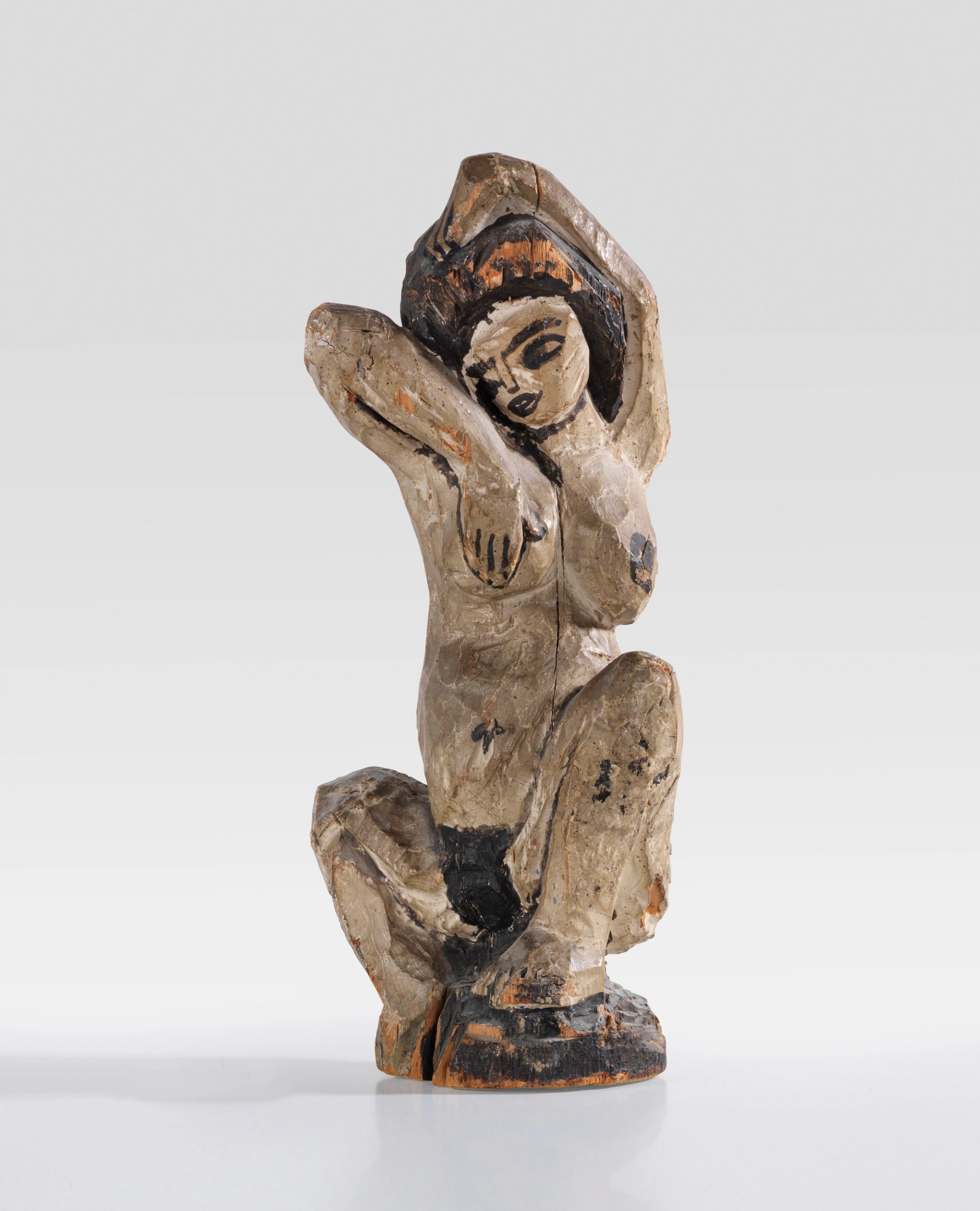 It is being offered alongside another wooden sculpture, made by Heckel’s Die Brücke peer and close friend Ernst Ludwig Kirchner. Hockende (squatting, 1910), has an estimate of €700,000 to €900,000, and depicts a female nude crouched over a round plinth. Kirchner often painted his sculptures, to varying degrees, and in this instance he has coloured several parts of the work in black to denote hair, eyes and genitalia. It was identified via an old photograph as having been included in the 1910 Brücke exhibition at Galerie Arnold in Dresden, the first show to include sculptures by either Heckel or Kirchner.