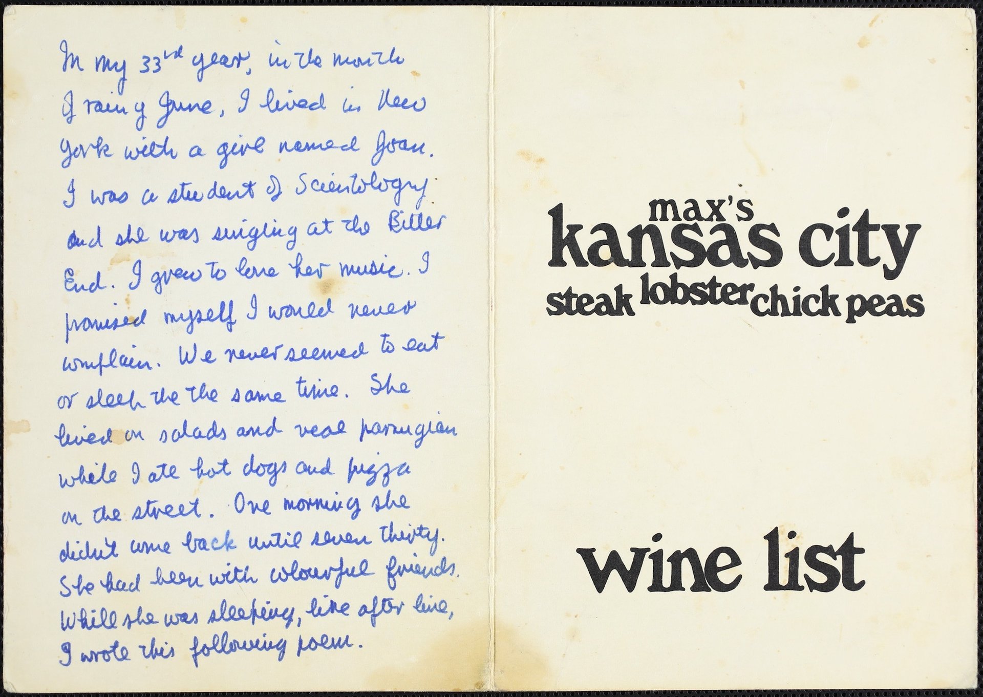 Leonard Cohen, Max's Kansas City, 1967. Notes on menu. © Leonard Cohen Family Trust.