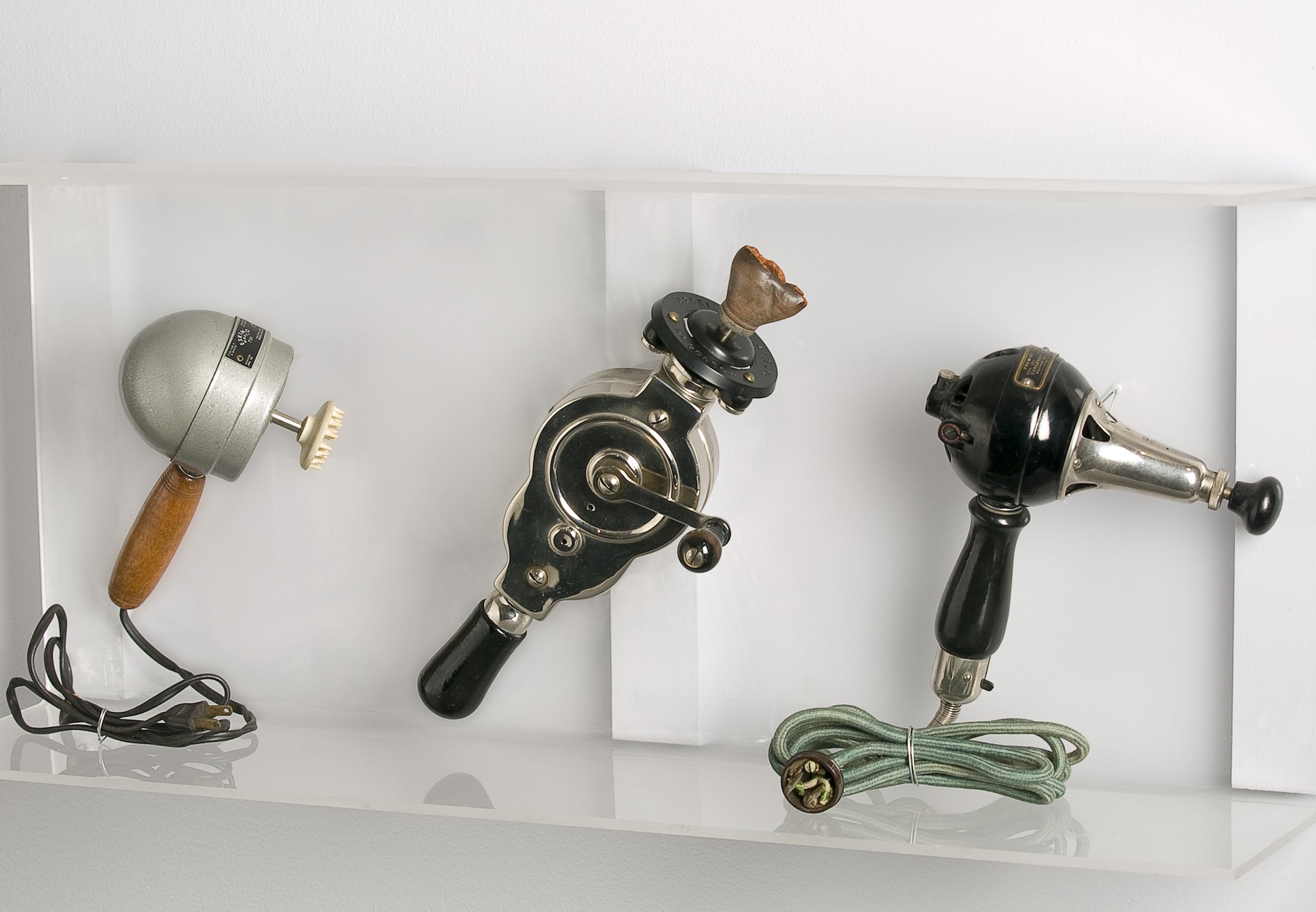 A display of three historic vibrators, from left to right: Handheld Eskimo Vibrator, Model 751, 1920, Bersted Manufacturing Corp, Museum of Sex Collection; Pulsocon, 1920, Macaura Institute, Museum of Sex Collection;