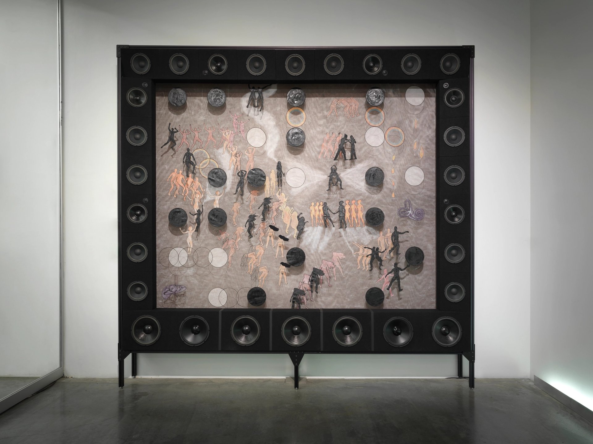 “The sounds from inside and outside of the artists’ bodies make us vibrate together,” the curator says. The show’s sensory multitude finds its footing in Vessel Flame and Vessel Body (both 2022), Caccuri’s embroideries, in which soft threads penetrate the punctured netting. Hairs flipped and arms bent, the woven gestures stem from the artist’s photographs of dancers at the parties she throws at her studio. The bodies’ repetition over the mesh surface strives to embody the partygoers’ delirious movements in reaction to the beats oscillating between paced down rhythms and booming spirals.