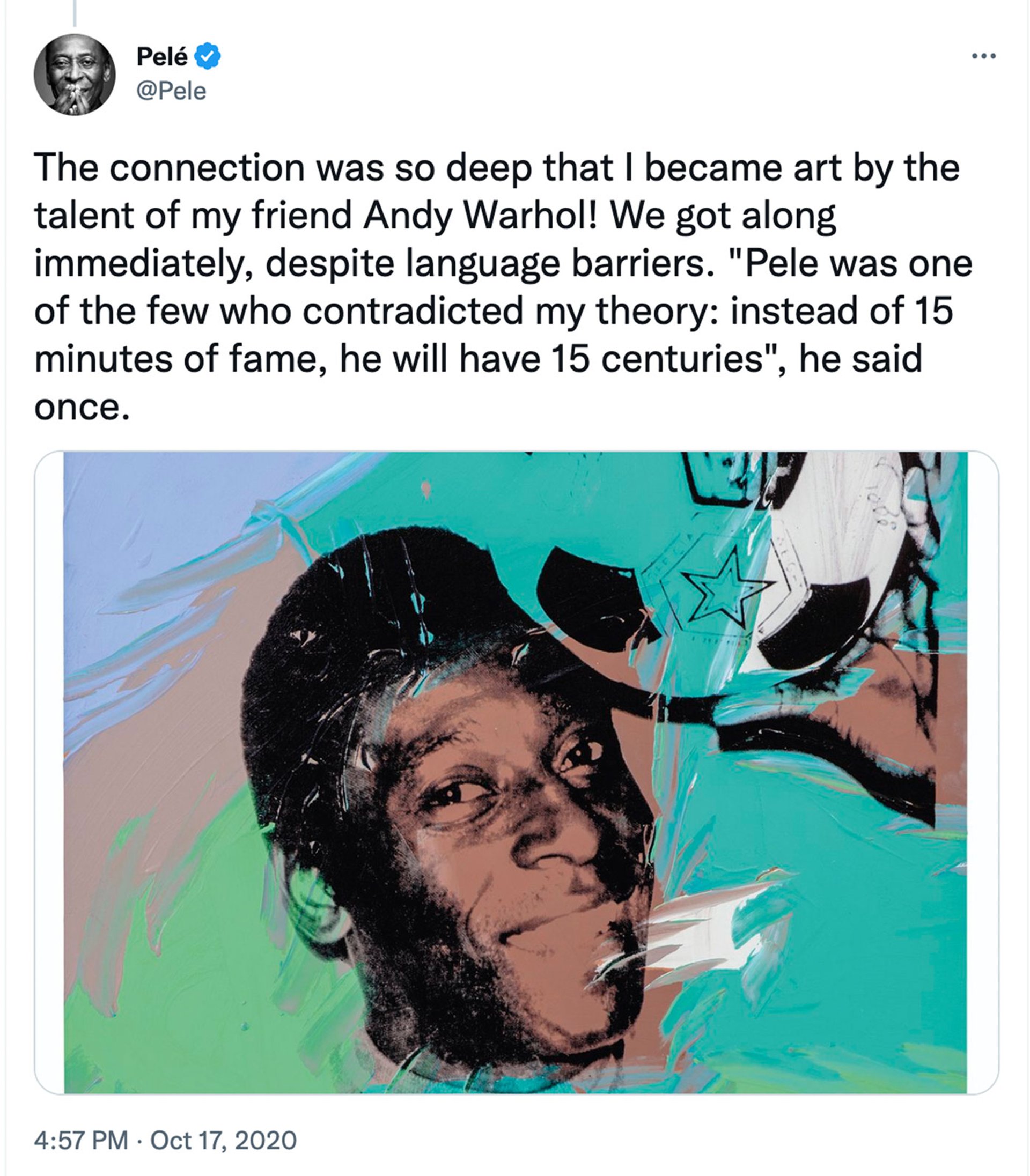 "I became art by the talent of my friend Andy Warhol. We got along immediately, despite language barriers," Pelé tweeted in 2020 twitter.com/pele