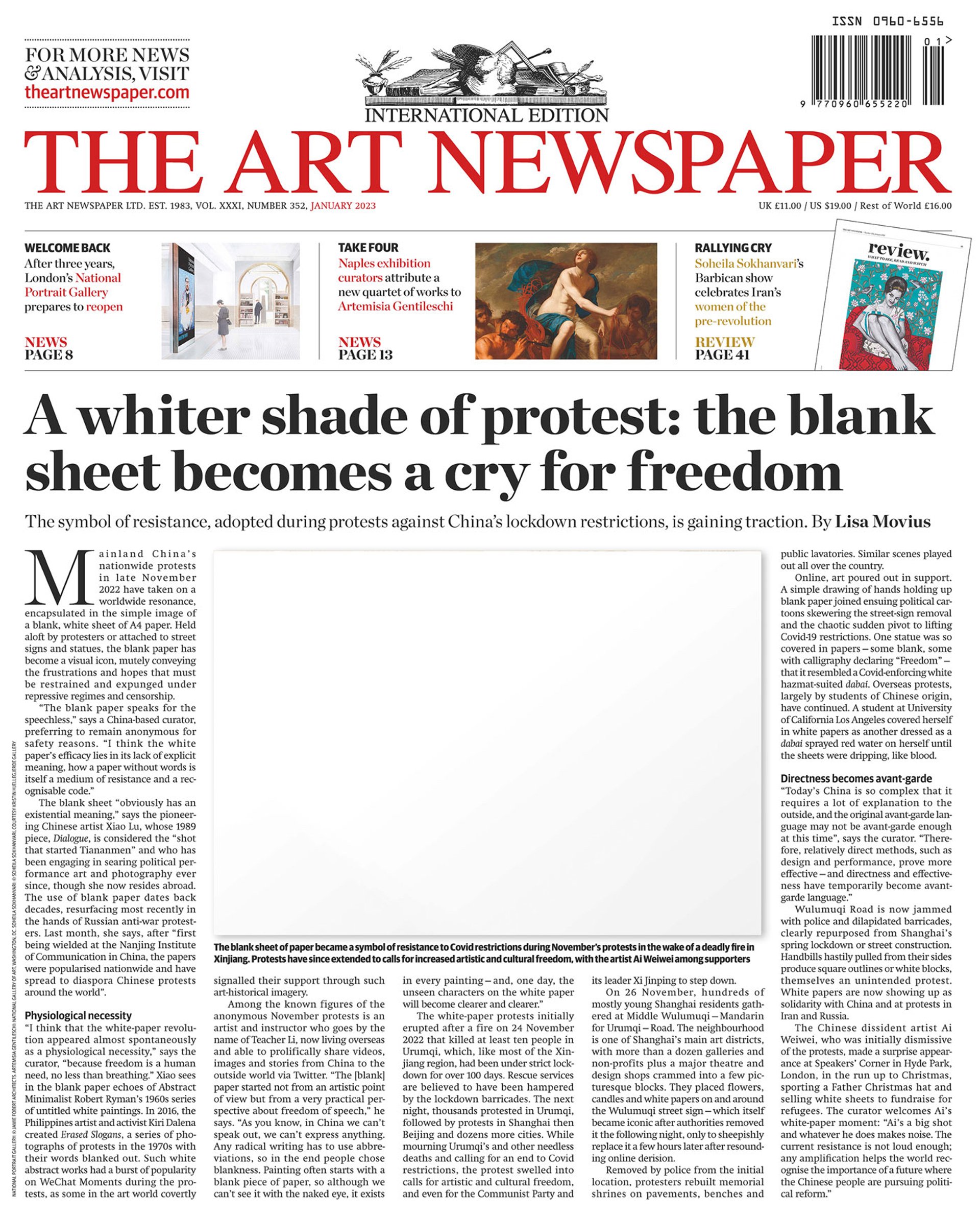 The front page of our January 2023 issue carries a blank image, reflecting how the use of blank paper has become "a medium of resistance and a recognisable code", says a China-based curator