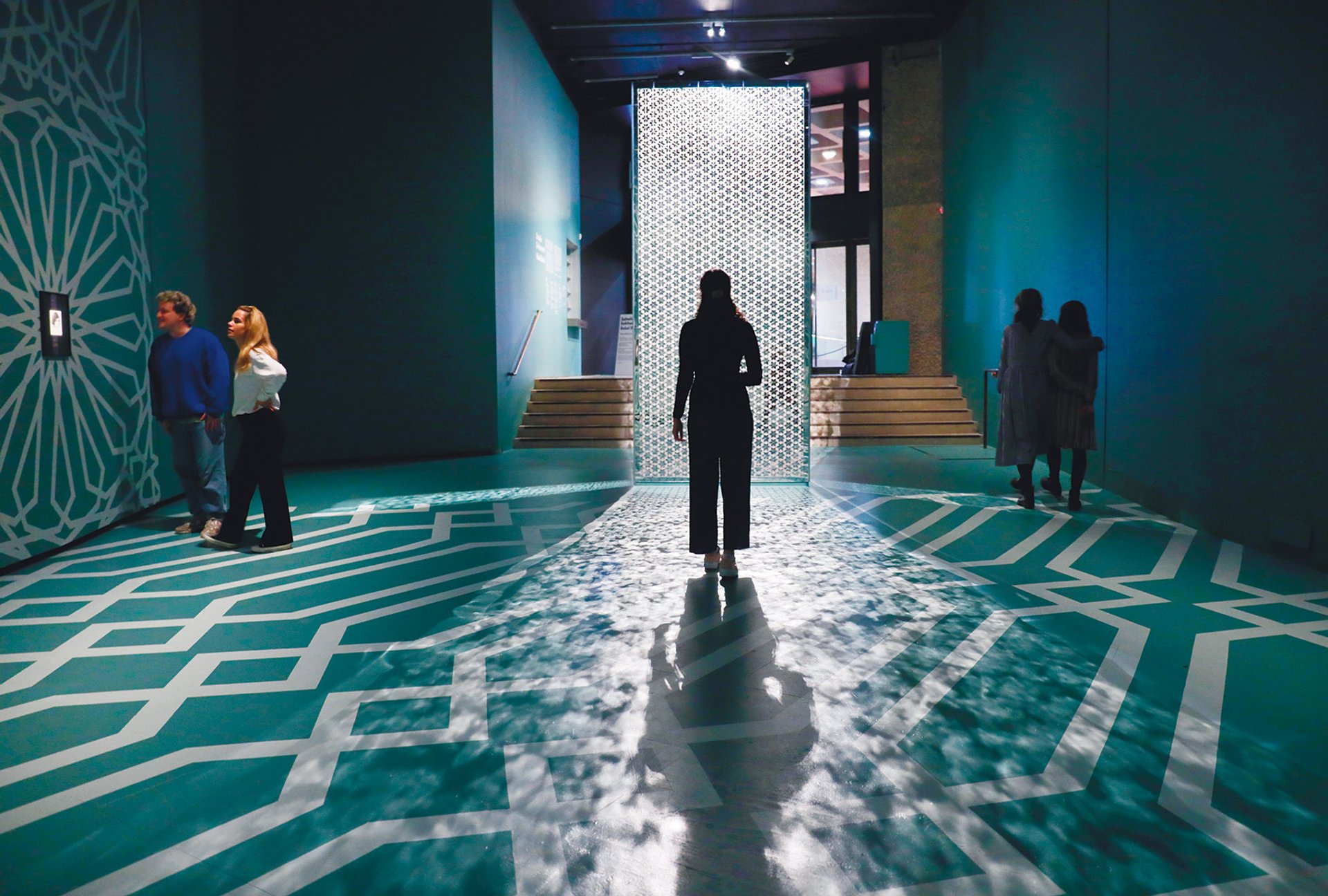 In Islamic architecture, pattern is also meant to be there for the purpose of creating a delirium in the viewer because apparently in the presence of utmost beauty you become delirious. So I wanted to create this kind of feminist delirium so that you can actually contemplate a sense of yourself at the same time as you contemplate these women. But I’m also very inspired by the way Stanley Kubrick uses pattern as a metaphor in his storytelling, for example, in The Shining, in the honeycomb patterning in the lobby of the hotel, or the phallic and uterus shapes on the carpet in Room 237. My monolith sculpture comes from him as well, as his way of storytelling through shape and pattern. Because I’m a collage of two cultures, my brain works as two threads that work together. I can’t help bringing these two languages together.