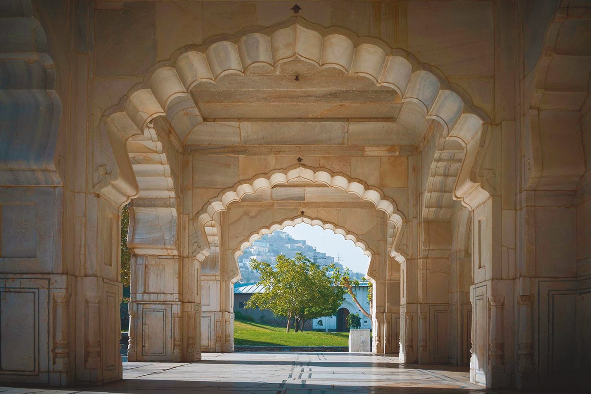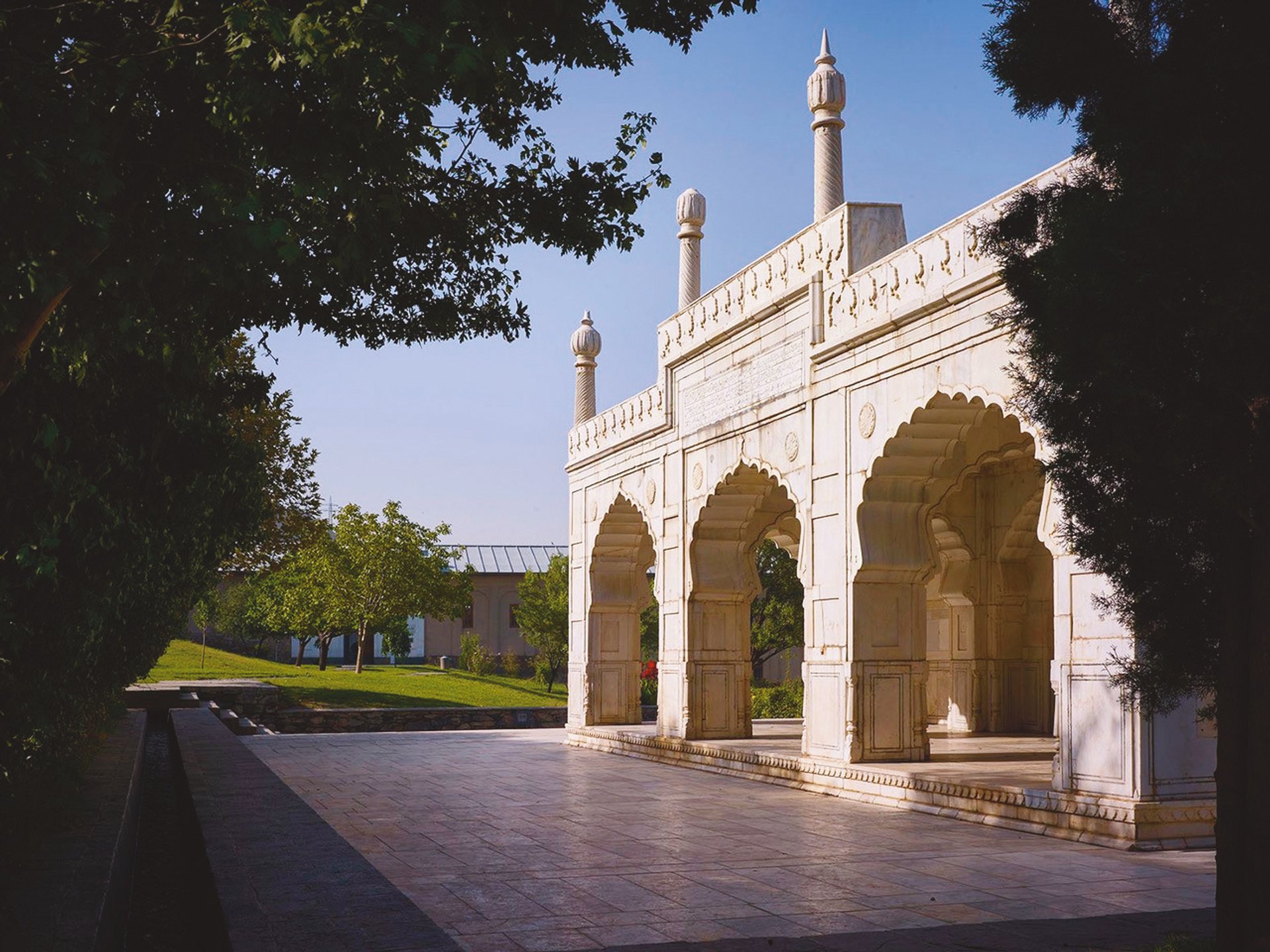 The Shahjahan mosque is one of several historic structures in the garden. Located on the 13th terrace, it was dedicated to the fifth Mughal emperor Shahjahan during a visit to the site in 1647. © Aga Khan Trust for Culture and Simon Norfolk