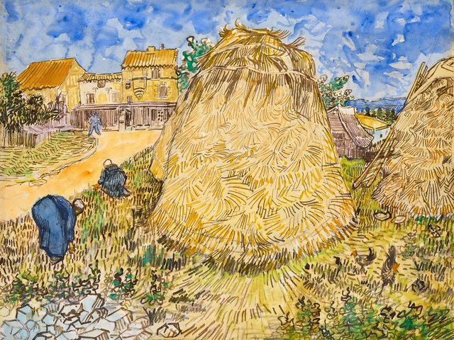 Van Gogh painted three slightly different pictures of women picking olives in the autumn of 1889, while living at the asylum on the outskirts of Saint-Rémy-de-Provence. The Goulandris version was the first, painted outdoors in the olive groves in November 1889, and is the most spontaneous of the trio. Two others were painted a month later, back in the artist’s studio room in the asylum, and they are more stylised.