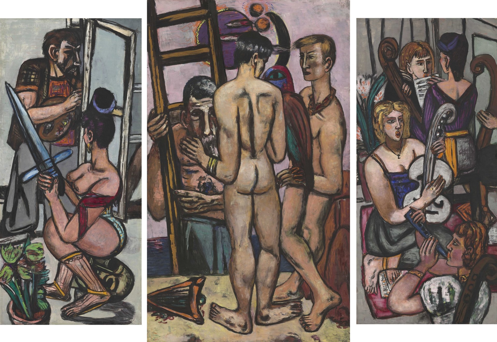 Loosely thematic but cunningly chronological, the show groups the paintings, without regard to decade, under motif-inspired headings such as The Sea and City Bar Hotel, culminating in a vast gallery called Cosmos Studio, where the artist’s exotic artefacts and atelier objects, placed in a V-shaped vitrine, are accompanied by a range of self-portraits. Beckmann’s studio, argue the curators, was a space for inner journeys and flights of fancy.