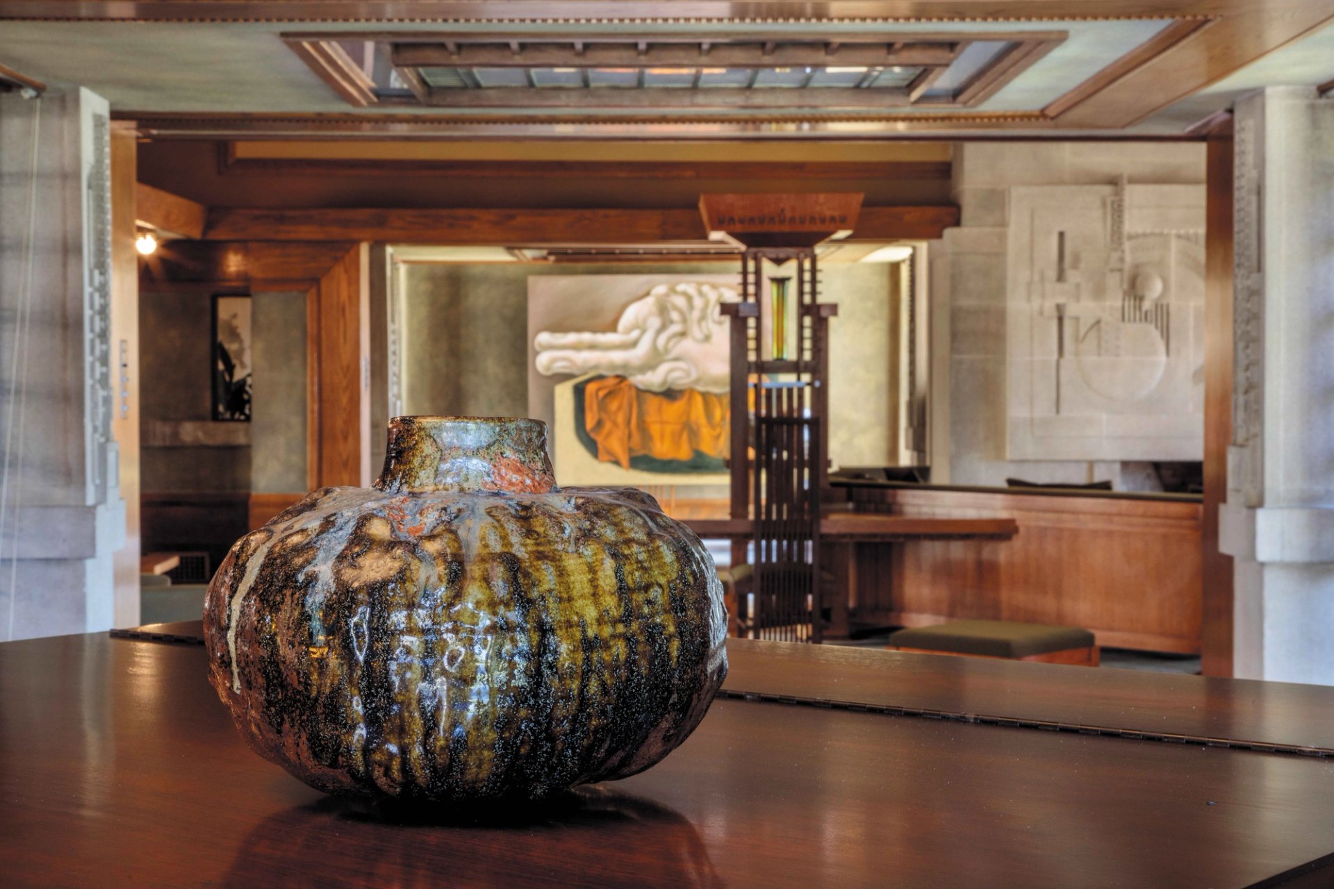 Located on Los Feliz’s Olive Hill, Frank Lloyd Wright’s 1921 Hollyhock House is a pioneering experiment in Southern California Modernism, with sumptuous details to satisfy the whims of the oil heiress and arts patron Aline Barnsdall. Entanglements: Louise Bonnet and Adam Silverman at Hollyhock House (until 27 May) is the house’s first intervention by contemporary artists, featuring new paintings by Bonnet and ceramic sculptures by Silverman. The two artists made their works in response to the house, reactivating the space as a site of creativity.