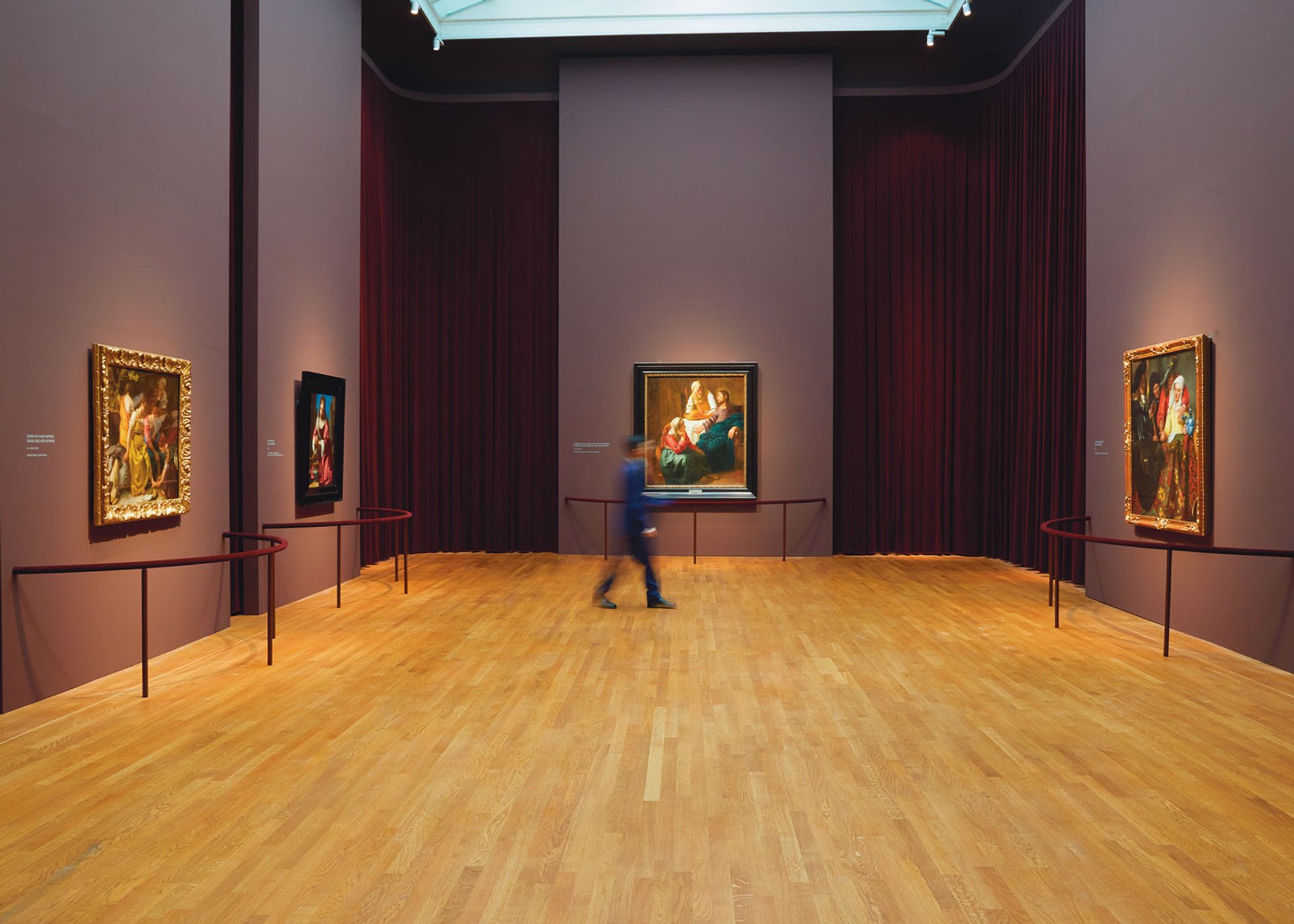 Installation view of Vermeer exhibition showing the use of velvet curtains to soften the space Photo: Rijksmuseum / Henk Wildschut