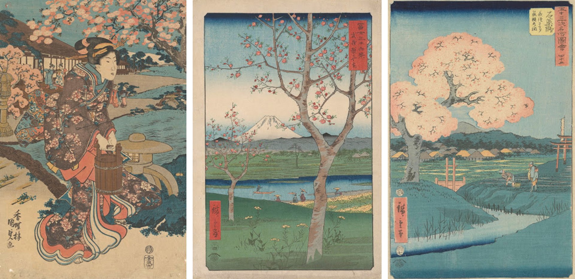Three Japanese prints of blossom, all from the collection of Vincent and Theo van Gogh, left to right: Utagawa Kunisada’s A Flower Game in the Garden (1830s); Utagawa Hiroshige’s The Outskirts of Koshigaya in Musashi Province (1858); and Hiroshige’s Ishiyakushi: The Yoshitsune Cherry Tree near the Noriyori Shrine (1855)