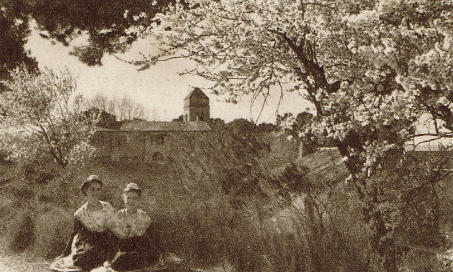 Almond trees just outside Saint-Paul-de-Mausole, with the asylum’s church in the background, postcard (1920s)