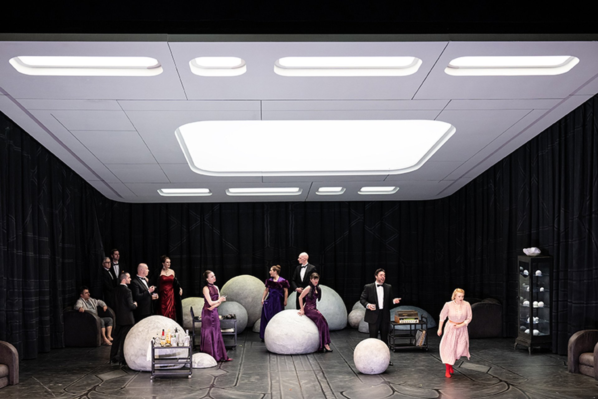Grünberg’s set is filled with hard moon-like rocks on which the nymphs play in their flowing silk nightgowns. In the human realm, these rocks are kept in glass cabinets, and at the party the prince throws for Rusalka, his guests fling them around while they swill cocktails and dance a nightmarish choreography. The prince finds a new lover, and he brings her along wrapped in their bedsheet, and even proposes marriage to her in front of the confused Rusalka who cannot express herself except by trying to kiss him. He throws her off more and more violently.