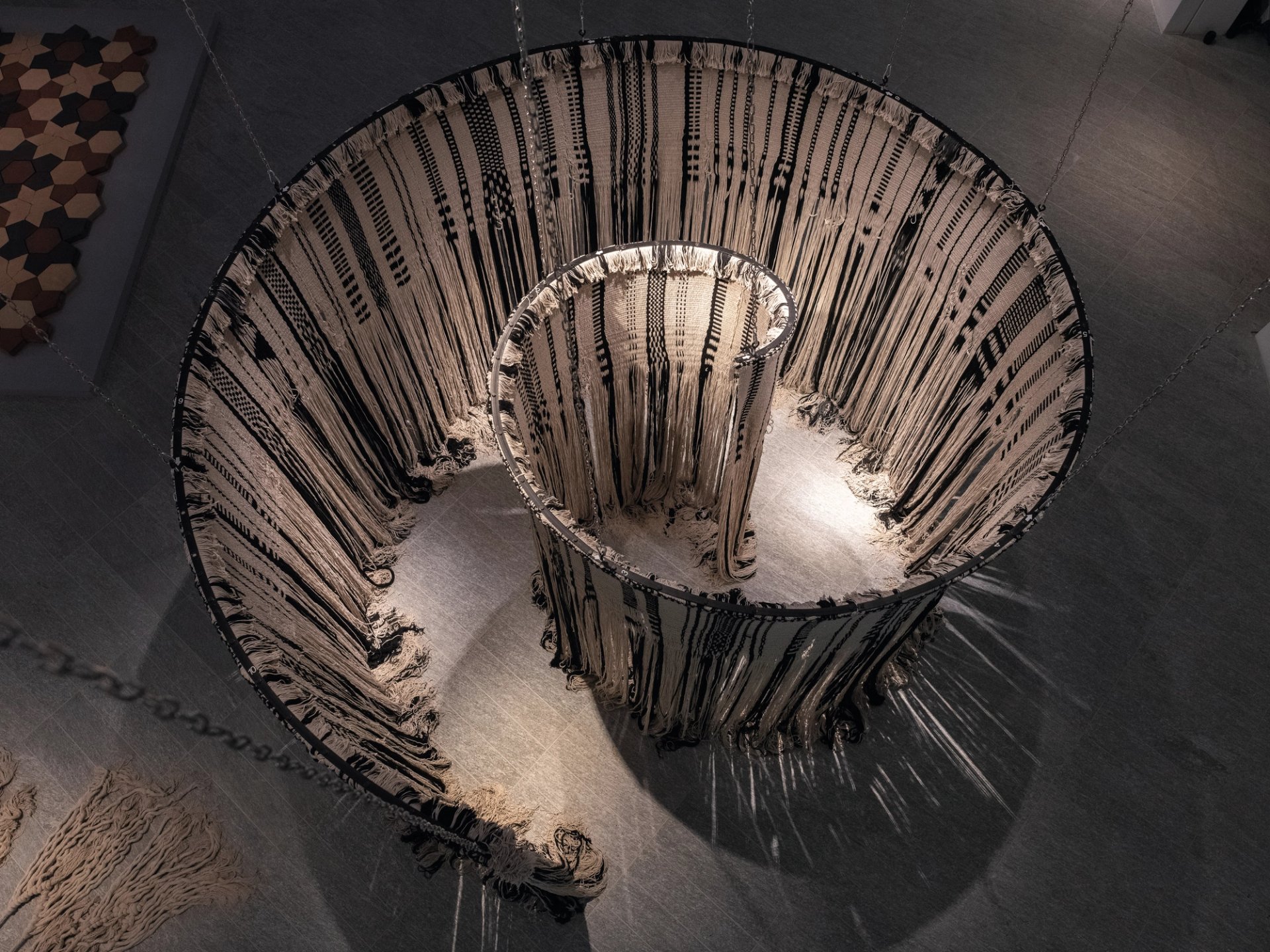 In the artwork, a large wall of woven fabric hangs on chains that come down from the ceiling of the gallery. Half way to the ground, the weave starts to become broken and disconnected, before splaying out at the bottom. “[The weavers] were quite distressed about the idea of destroying the weave. That was something we did together. Just to symbolise the demise of what it means to be a craftsperson and where they stand in society.”