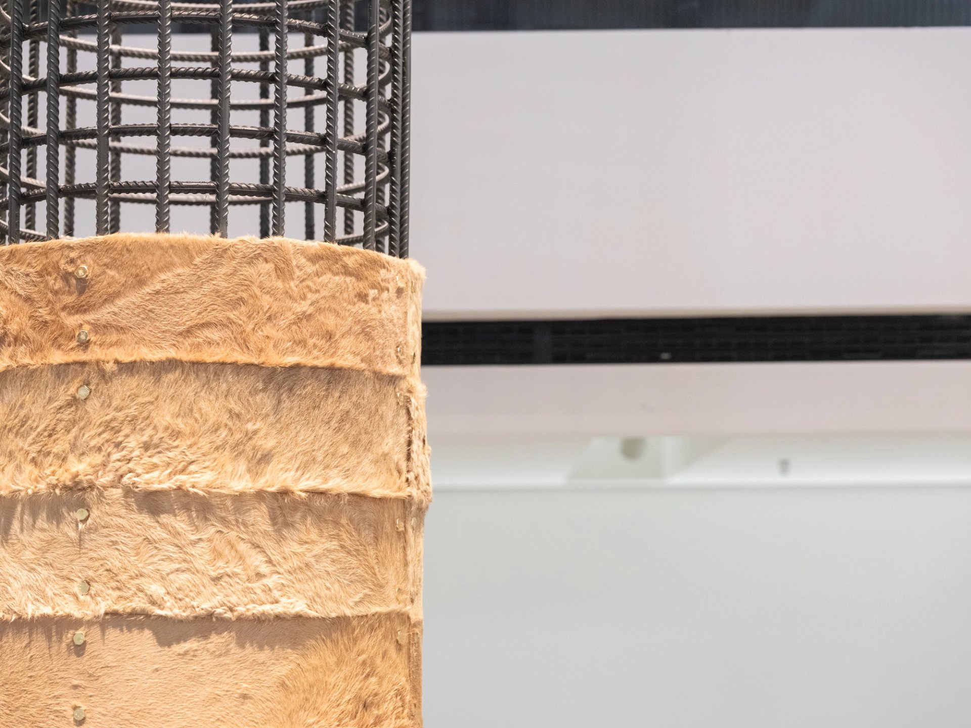 Previous works in the series have been installed in dramatic locations: in the Saudi Arabian desert at AlUla and in front of the pyramids in Egypt. There the camel hide blends into the landscape—and may even be met by a passing beast of burden—but in the Louvre Abu Dhabi it stands out starkly. In the commission for the pyramids, Alhashemi created a wireframe obelisk only partly covered by hide, a reference to the obelisk in Aswan which cracked as it was being carved and was left unfinished. At the Louvre, she has made a similarly incomplete column, The Fourth Pillar, matching those holding up the gallery, a jarring combination of man-made and natural.
