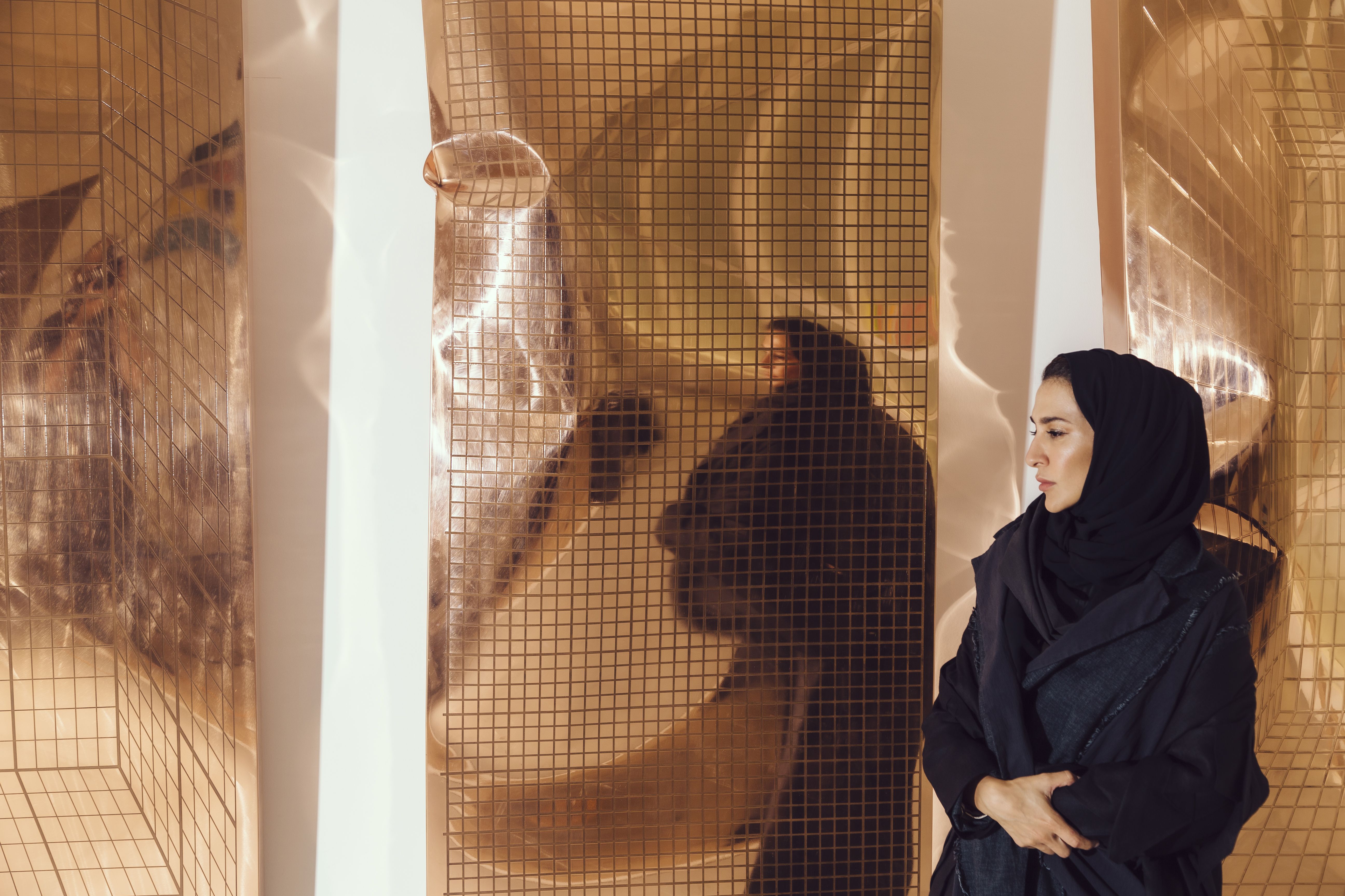 Alhashemi did not consider becoming an artist until a car accident left her unable to work. She had always been creative but associated it with drawing and painting: an encounter with conceptual art validated her desire to create works on a larger scale that did not need to be handmade. She now uses multiple media in her installations, often requiring them to be made by several workshops. A previous work exhibited at the Louvre Abu Dhabi, Metamorphic (2018), combined layers of reinforced metal mesh with delicate squares of stained glass.
