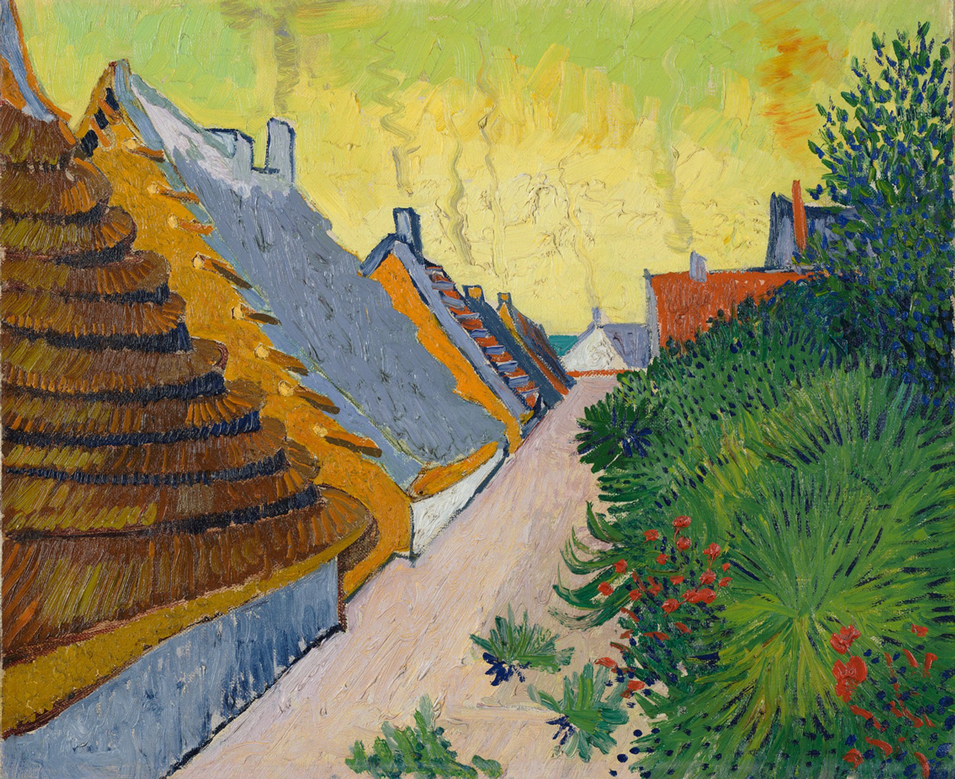 Houses in Saintes-Maries-de-la-Mer (June 1888), which is also coming to the exhibition, is one of Van Gogh’s most boldly coloured landscapes. It depicts a row of low-roofed cottages in the Mediterranean fishing port of Les Saintes-Maries-de-la-Mer, which the artist visited in May 1888. With its plunging perspective, the viewer is led down the road, edged with houses and dense vegetation, towards a tiny triangle of light-blue sea.