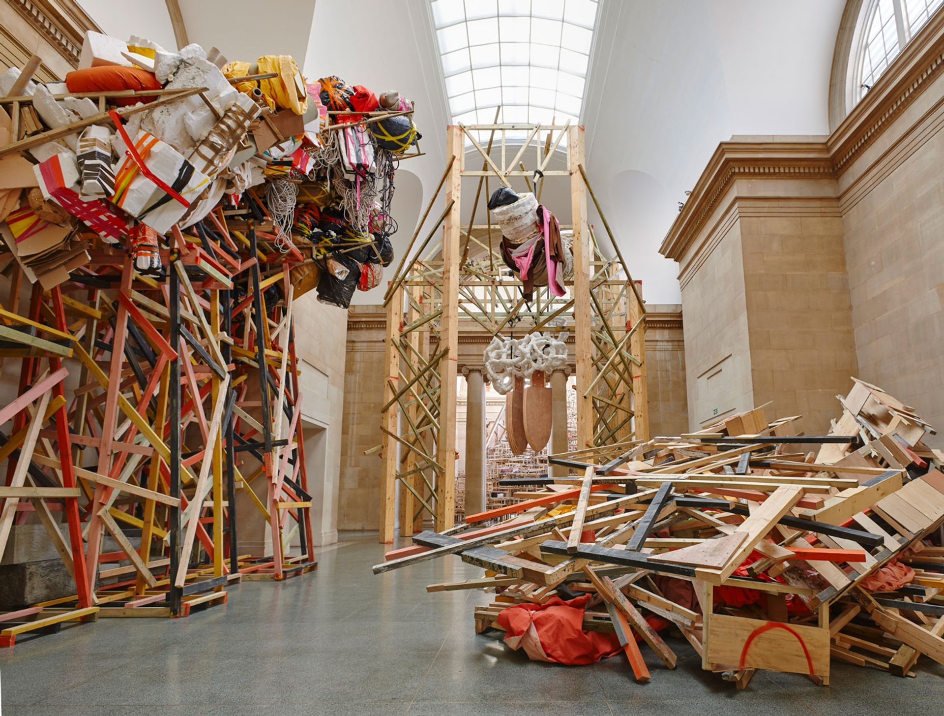 This was evident in an extraordinary series of works made in the 2010s, from Tip (2013), a forest of cement, timber, steel mesh and fabrics that flowed out from the Carnegie Museum of Art in Pittsburgh, to dock, her show cramming into the Duveen Galleries at Tate Britain in 2014, and, perhaps most notably, her 2017 work folly, filling seemingly every inch of the British pavilion at the Venice Biennale. In each case, she took on loaded spaces: the ghosts of artists past at the Carnegie and Tate, the national pavilion of Britain in the year after Brexit—an event that appalled her—with characteristic boldness and risk.