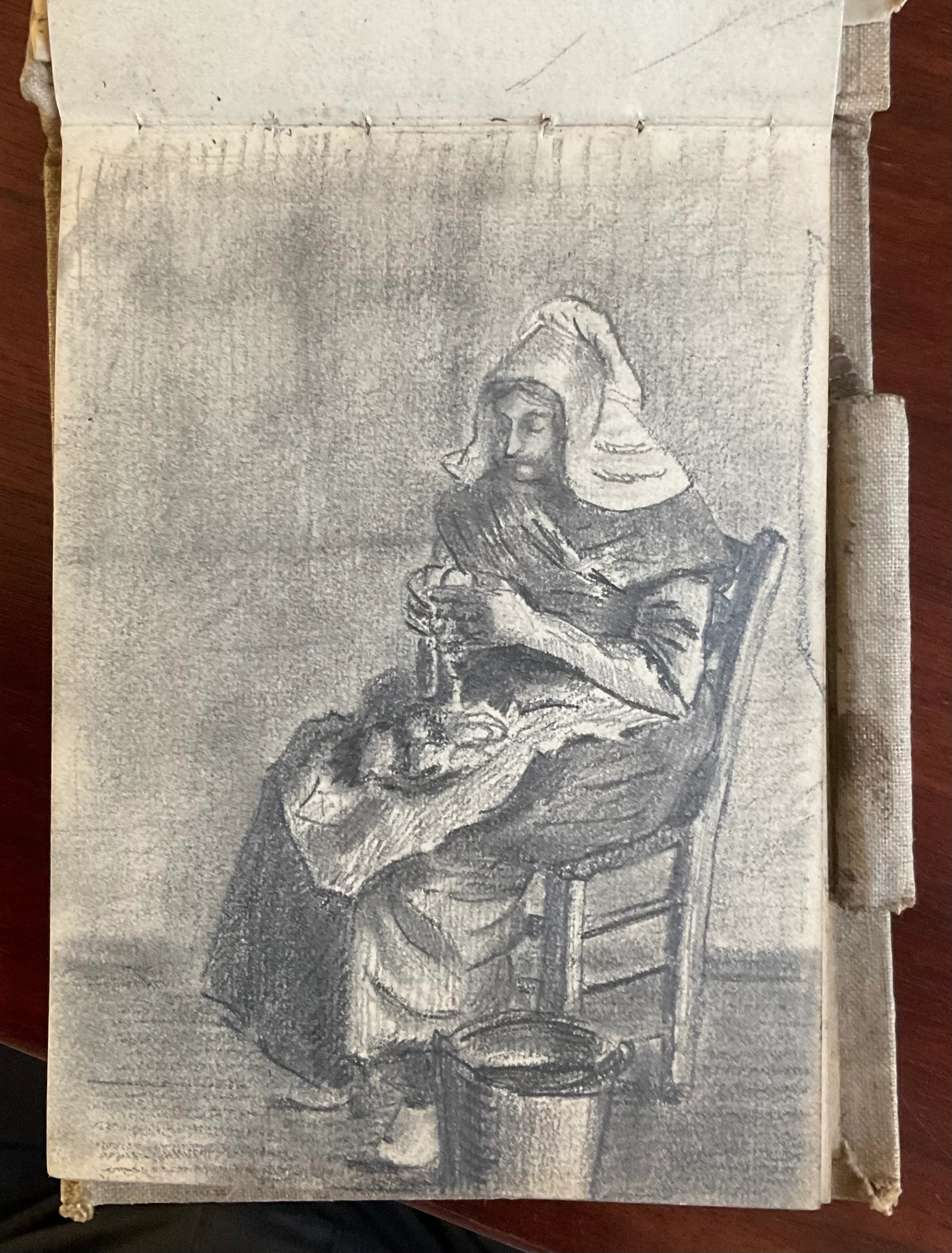 A recently discovered sketchbook by 16-year-old Catharina Kam includes a drawing of an elderly woman peeling potatoes, a subject tackled simultaneously by Van Gogh. Catharina along with her brothers Jan and Willem knew Vincent well, and together they used to go on sketching excursions in the Dutch countryside. It was almost certainly on one of these occasions that Catharina and Vincent both drew the woman.