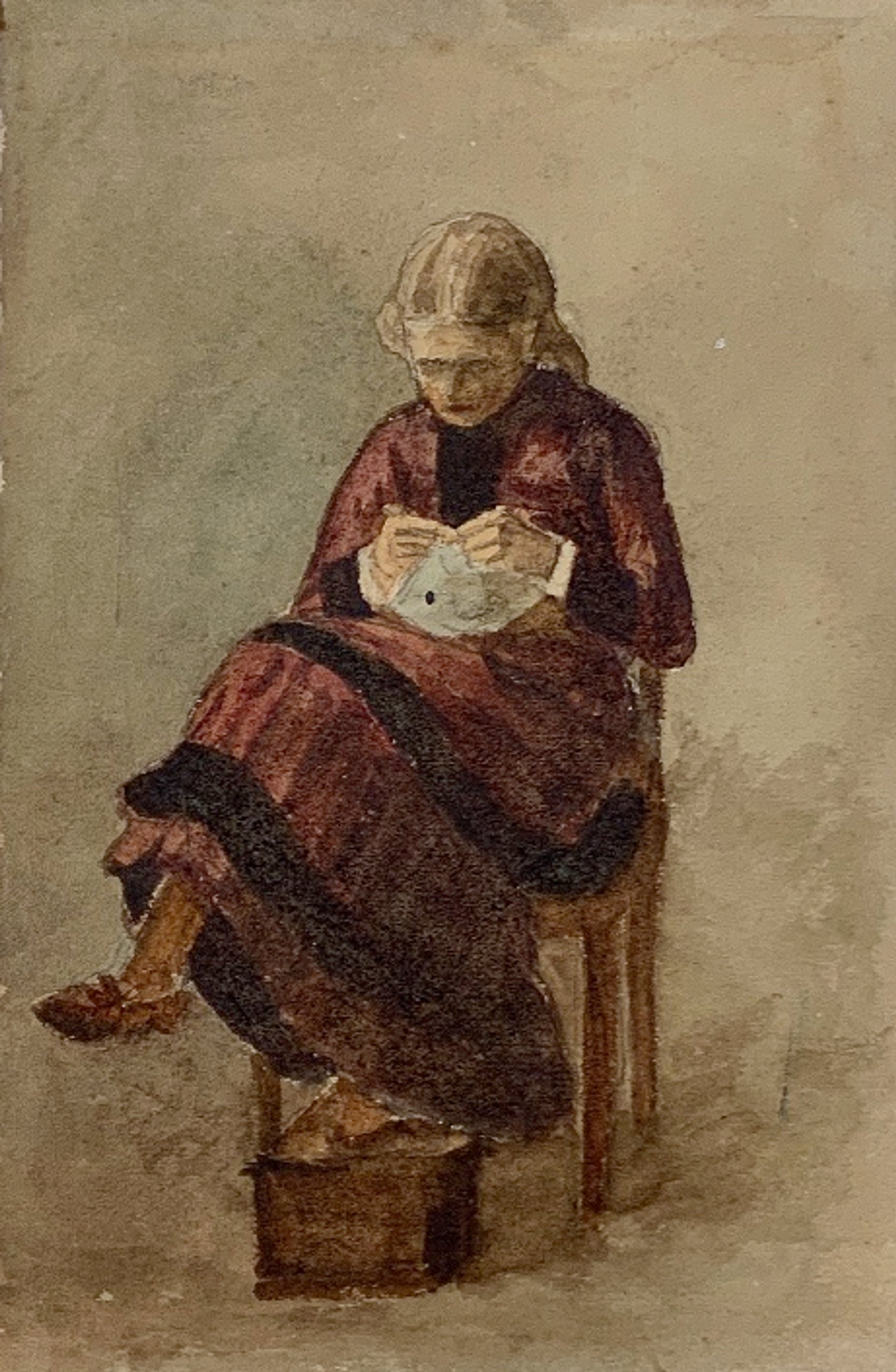 By complete coincidence, the only image that seems to have survived of Catharina at roughly the time she knew Van Gogh is a watercolour which shows her in a fairly similar pose to the elderly woman. Catharina rests one foot on a traditional box warmer. Depicted seated, from a similar angle, she too concentrates on a task - crocheting or lace-making, rather than peeling potatoes. It was painted by her brother Willem Hendrik (1863-1918), who went on to become an architect and draughtsman.