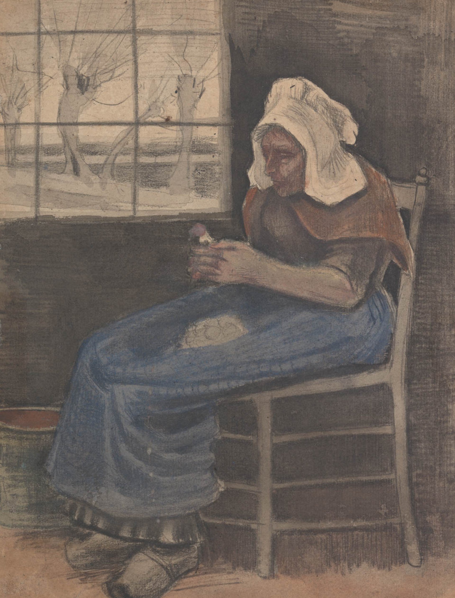 The identity of the woman, wearing a traditional white bonnet and wooden clogs, remains unknown. Van Gogh has included a view from her window, a row of pollarded willows, but this is probably an imaginary landscape typical of the area, and not what could actually be seen from inside her hut. Catharina only vaguely indicated the window, leaving greater emphasis on the figure.