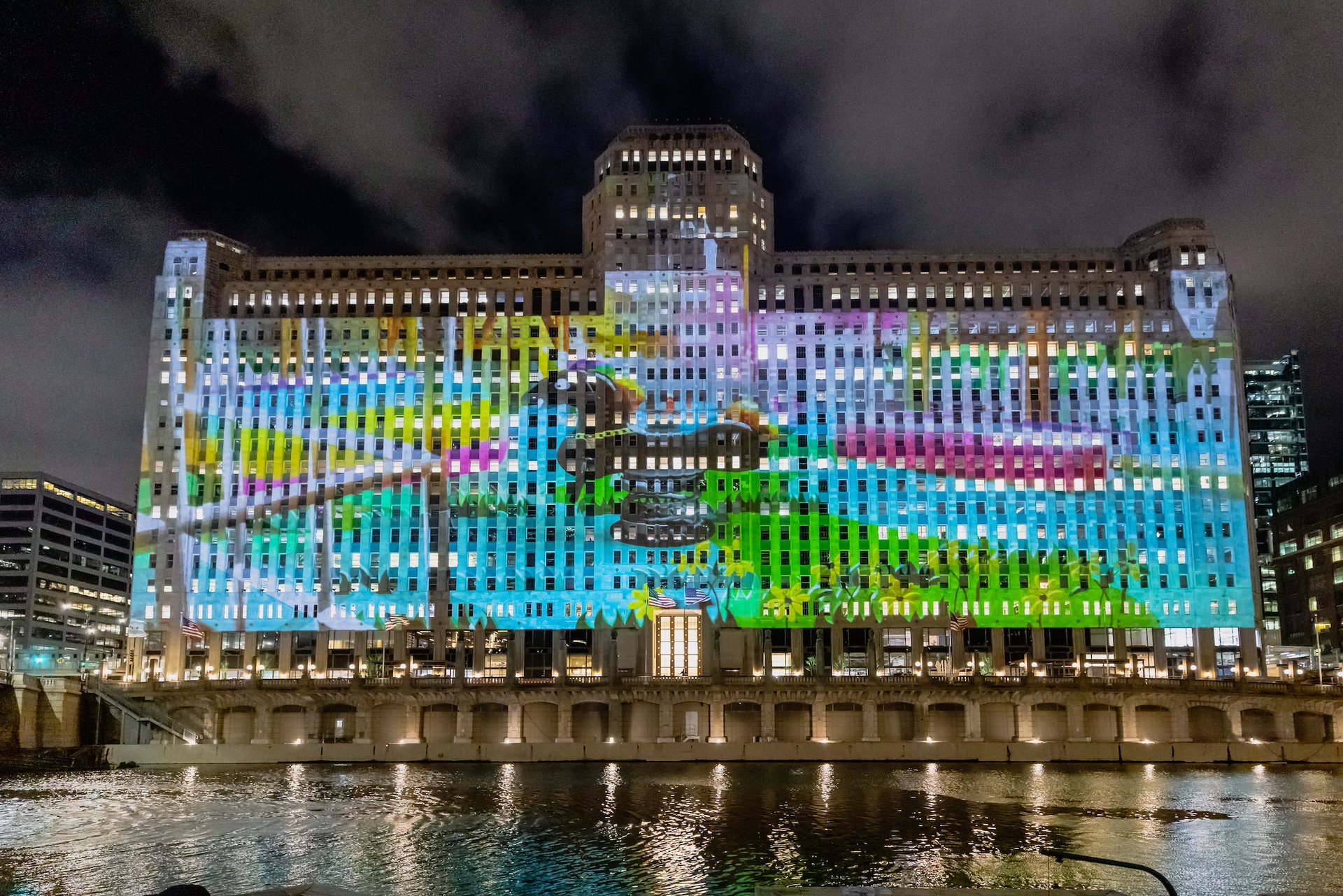 In addition to a delightful interactive installation in the Expo Chicago fair’s public art programme, Adams is presenting a newly commissioned projection for Art on theMart, which bills itself as the largest permanent digital art programme in the world (14 April-5 July). Presented in partnership with the Chicago Department of Cultural Affairs and Special Events,the installation involves projecting contemporary art across the 2.5-acre façade of the biggest privately held commercial building in the US, the hulking Art Deco Merchandise Mart Plaza along the Chicago River.