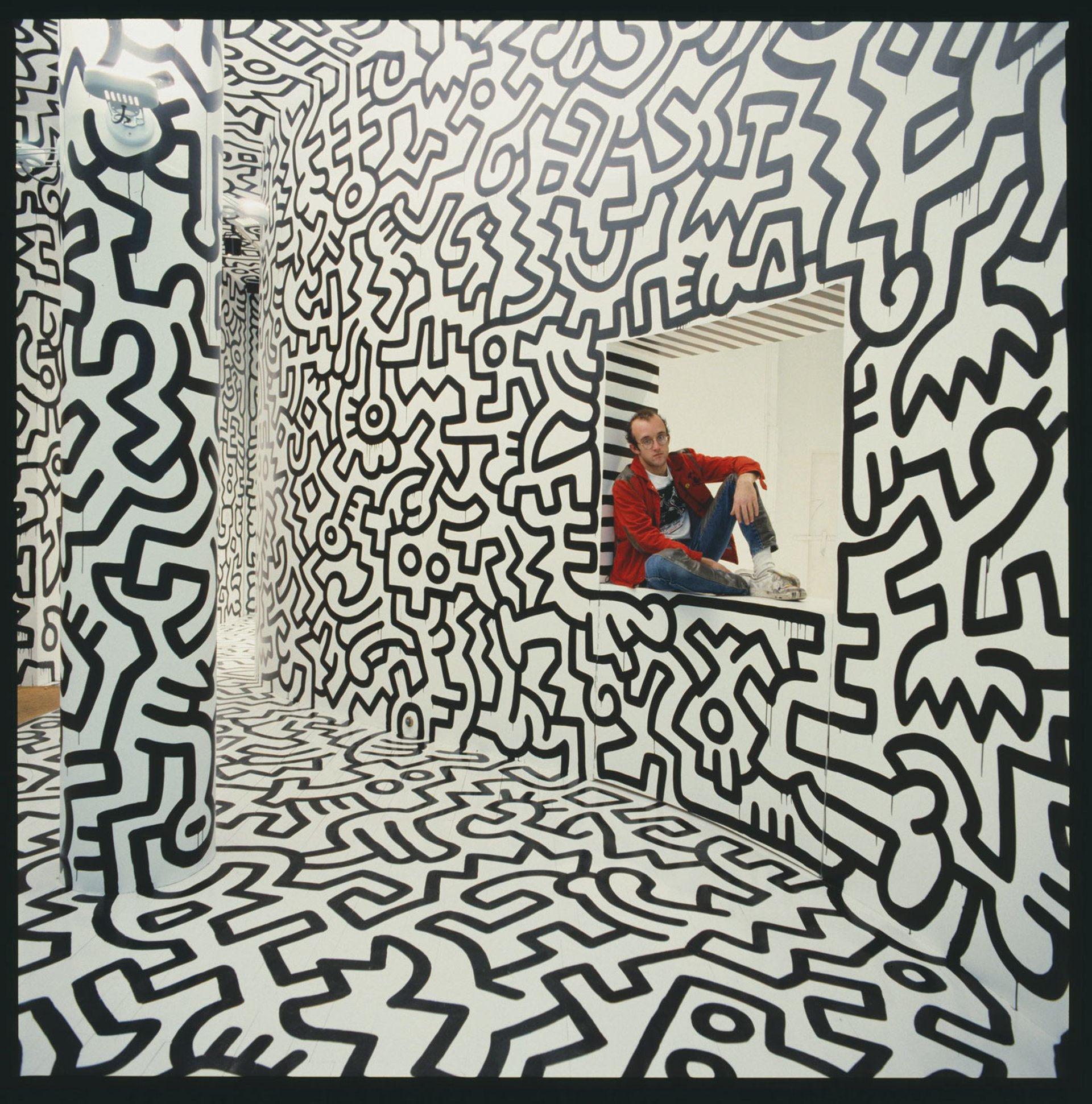 Tseng Kwong Chi's photograph of Haring in his Pop Shop, New York, 1986 Photo: © Muna Tseng Dance Projects Inc. Paintings: © The Keith Haring Foundation