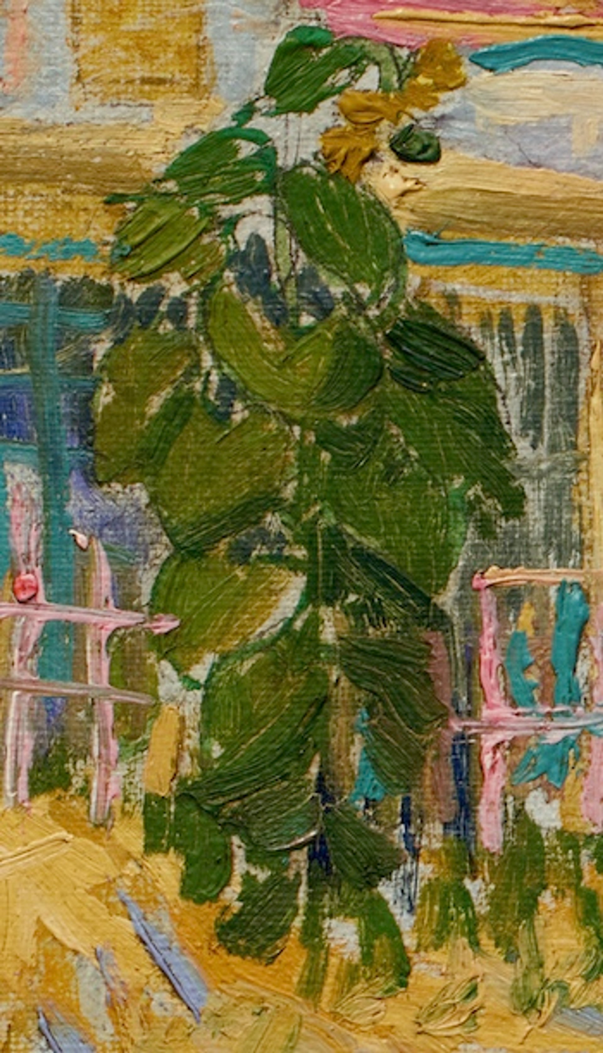 In the centre of the composition are several giant sunflower plants, apparently much taller than a person. It would be just a year later, in Provence, that Van Gogh created his famed Sunflower still lifes.