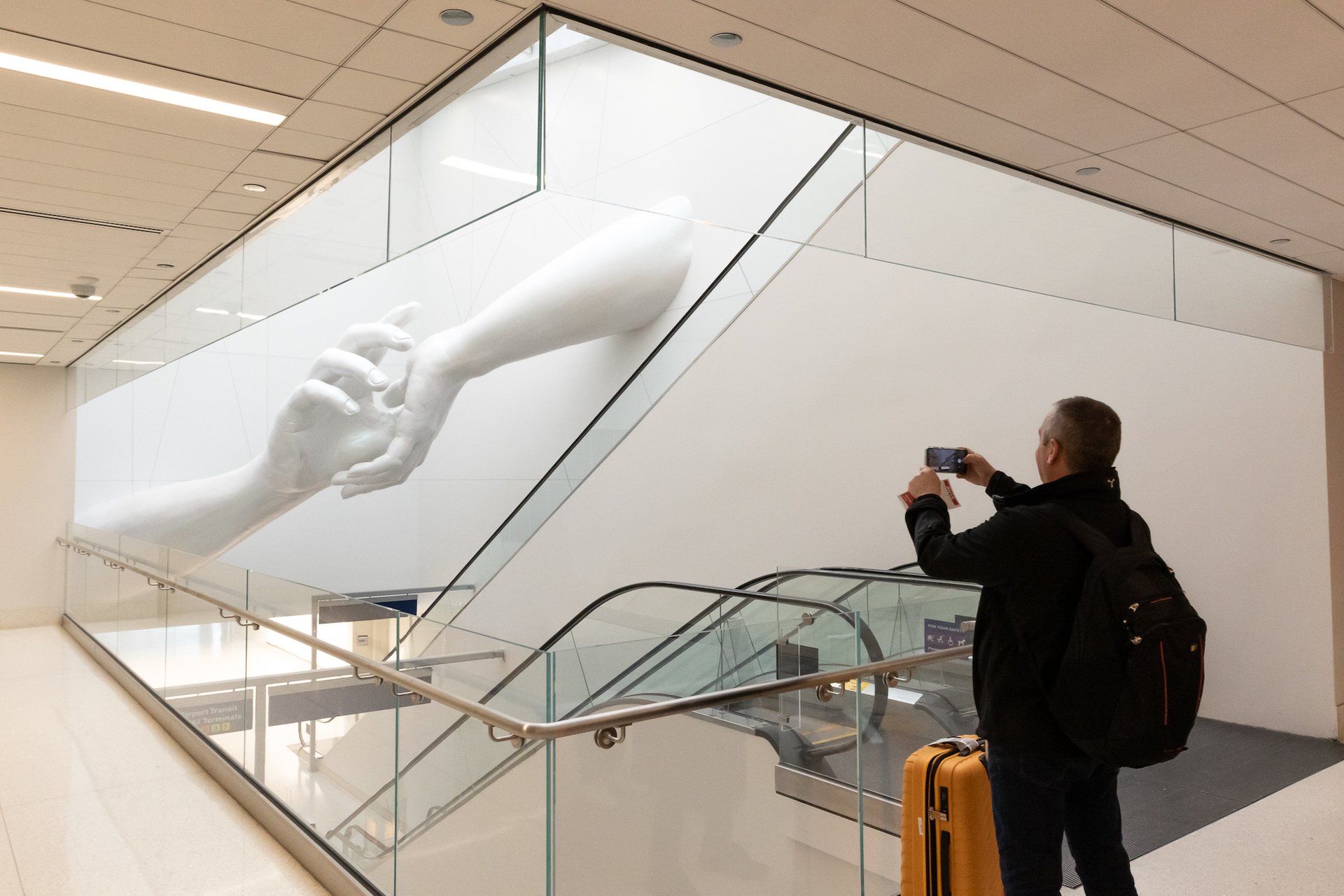Fresh off of high-profile sculptural turns at the Super Bowl and in Boston—where his monument to Martin Luther King, Jr. and Coretta Scott King, The Embrace (2023), was the subject of much debate following its unveiling in January—Thomas has collaborated with Kennedy on the colossal sculpture, REACH (2023), which is now installed above escalators in the airport’s Multi-Modal Facility.