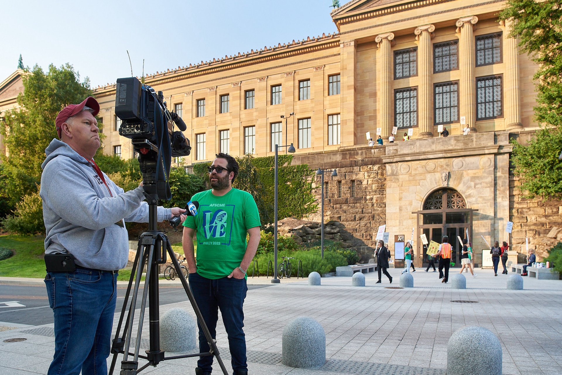 Philadelphia Museum of Art educator Adam Rizzo speaks with a reporter during last year's strike Photo by Tim Tiebout