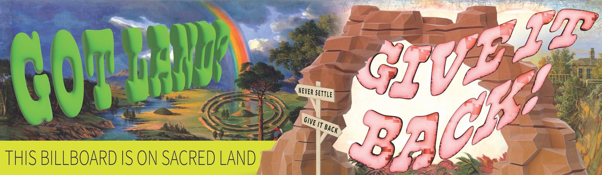 New Red Order, Give it Back: Stage Theory (2023), billboard at Sugarloaf Mound Commissioned by Counterpublic 2023