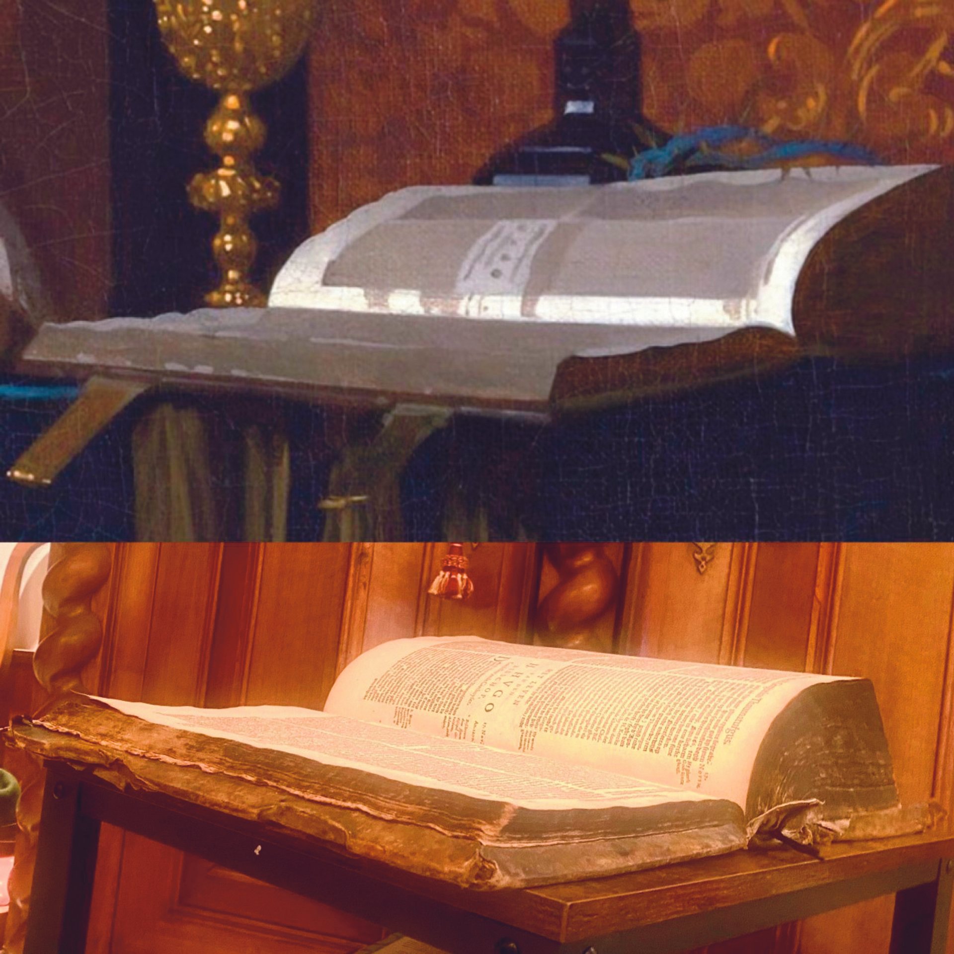 Top to bottom: Detail from Allegory of Catholic Faith (around 1670-74) / A photo of the 1640 edition of Legende der Heylighen (legends of the saints) by Pedro Ribadineira and Heribert Rosweyde