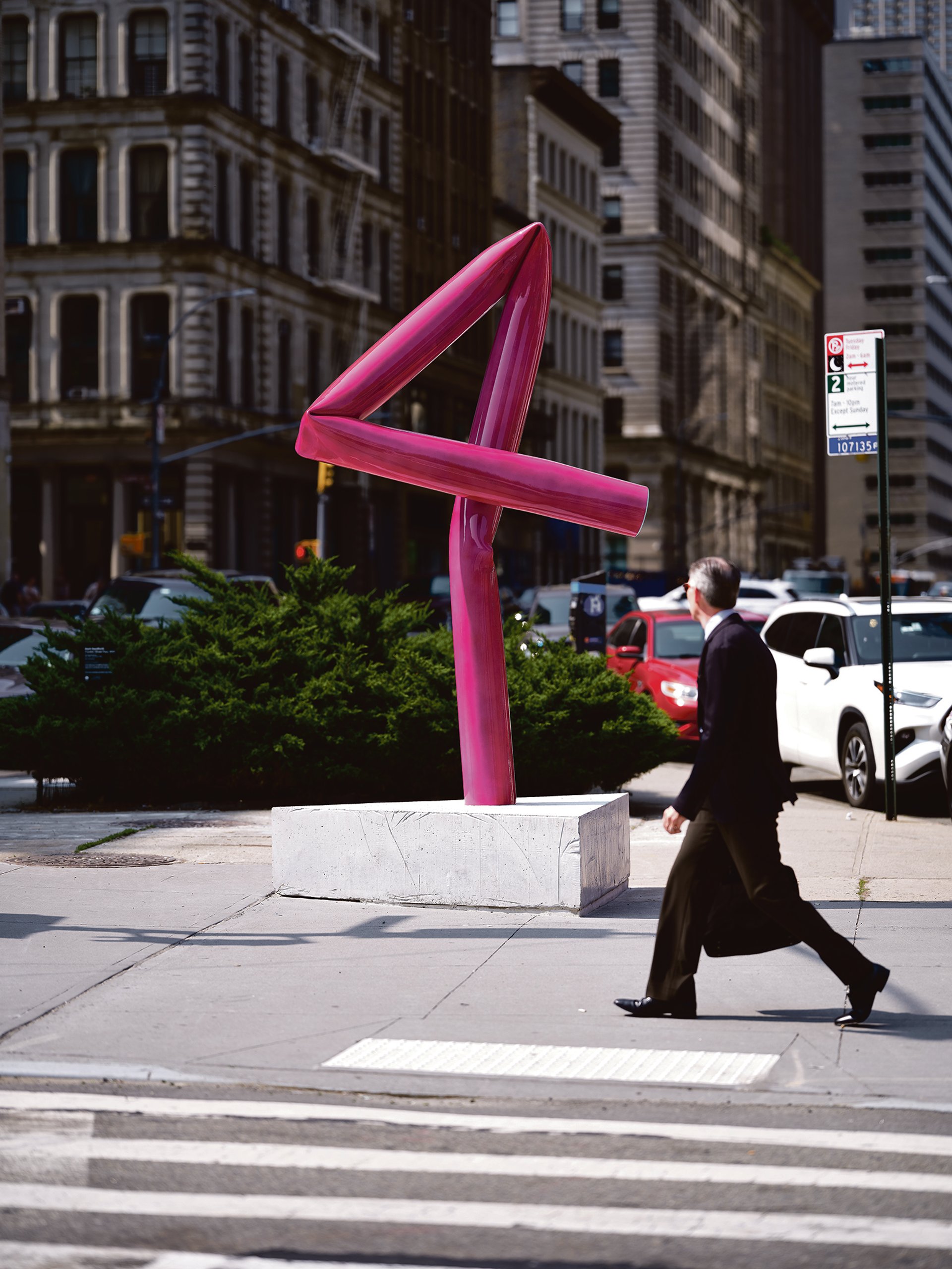 Gallery-hoppers out in Tribeca this week will be struck by a neon-hued addition to Barnett Newman Triangle, the traffic wedge at the intersection of Church and White streets, which Newman’s studio overlooked. Sculptor Mark Handforth’s new work at the site, Franklin Street Four (2023), is a tall metal cylinder twisted to form the number four. It is finished in bright pink, an allusion to the hue of Dan Flavin’s 1971 portrait of Newman in fluorescent lights (now in SFMoMA’s permanent collection). Handforth’s tribute is on view until November; his solo show across the street at Luhring Augustine continues until 28 July.