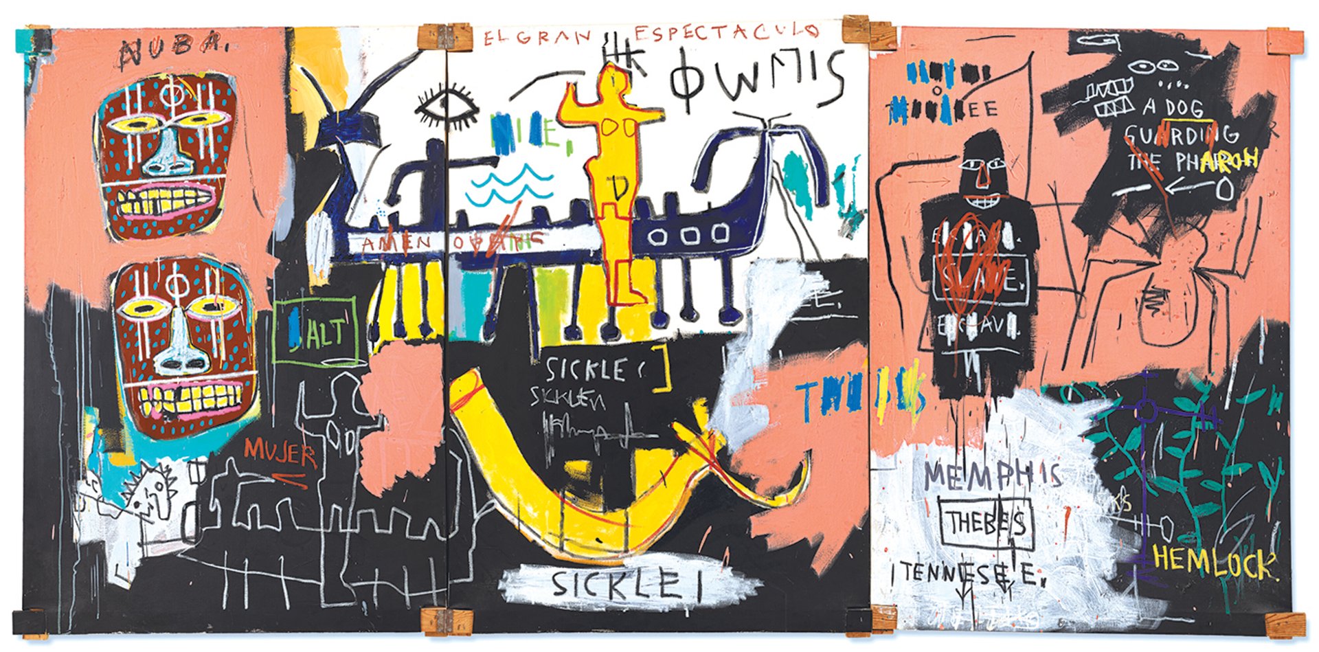 At Christie’s 21st century art evening sale Monday night (15 May), the star lot was Jean-Michel Basquiat’s monumental El Gran Espectaculo (The Nile) (1983), which sold for $58m ($67.1m with fees) after a five-minute bidding war between several would-be buyers. The underbidder was later revealed to be mega-dealer Larry Gagosian, who worked with Basquiat before the artist’s tragic death in 1988. The eight-figure price tag makes El Gran Espectaculo the fourth most valuable Basquiat work ever sold at auction. Rival auction house Sotheby’s will offer its own large-scale Basquiat when Now’s The Time (1985) goes up for sale Thursday (18 May), estimated to fetch $30m.
