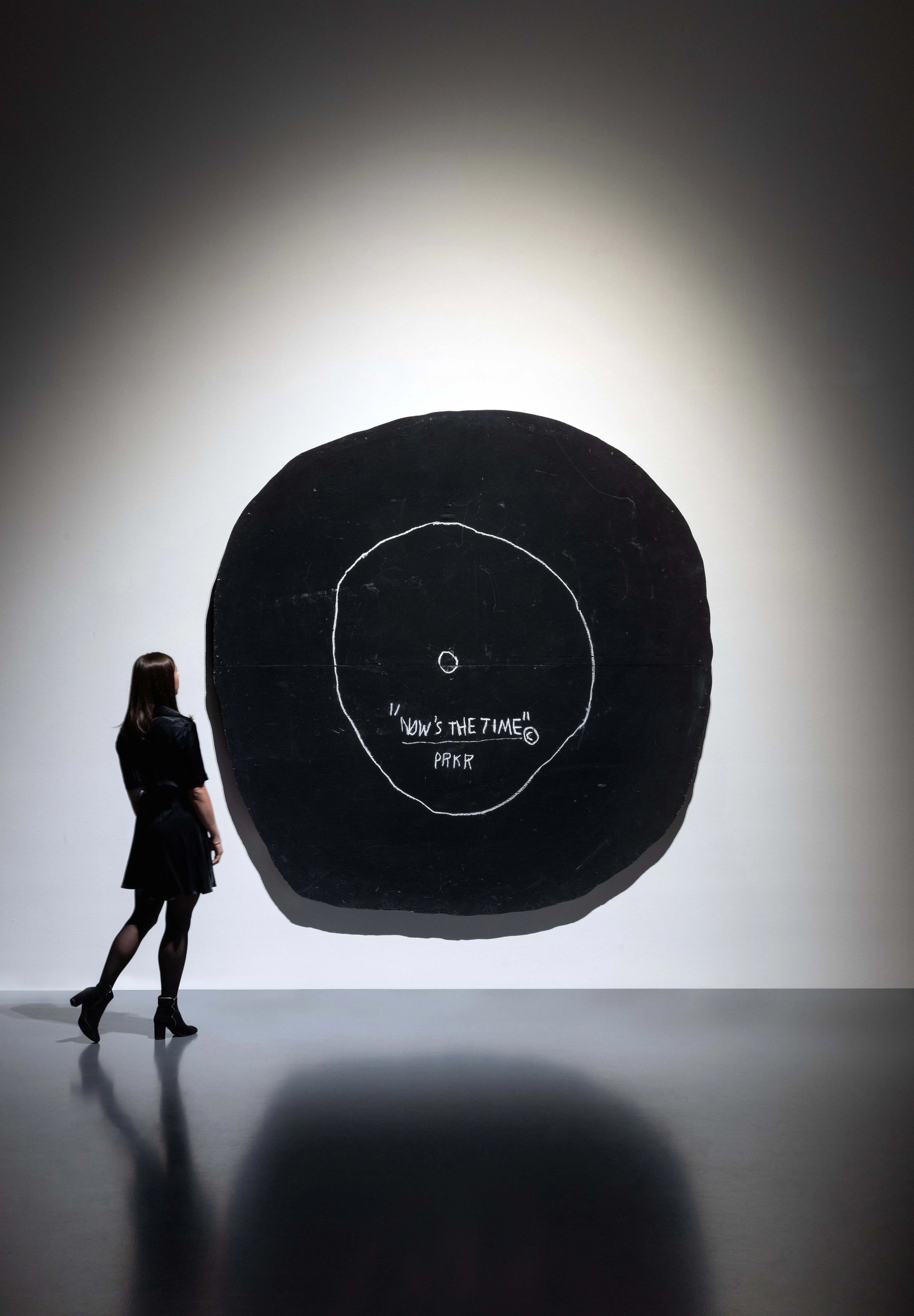 Hovering between sculpture and painting, Jean-Michel Basquiat’s jazz infused, tondo-shaped and jumbo vinyl record-like Now’s the Time (1985), comprised of acrylic and oilstick on wood, hit a modest volume at $25.5m ($28.6m with fees). That fell short of the unpublished estimate of in excess of $30m, but it got away with the help of an irrevocable bid.