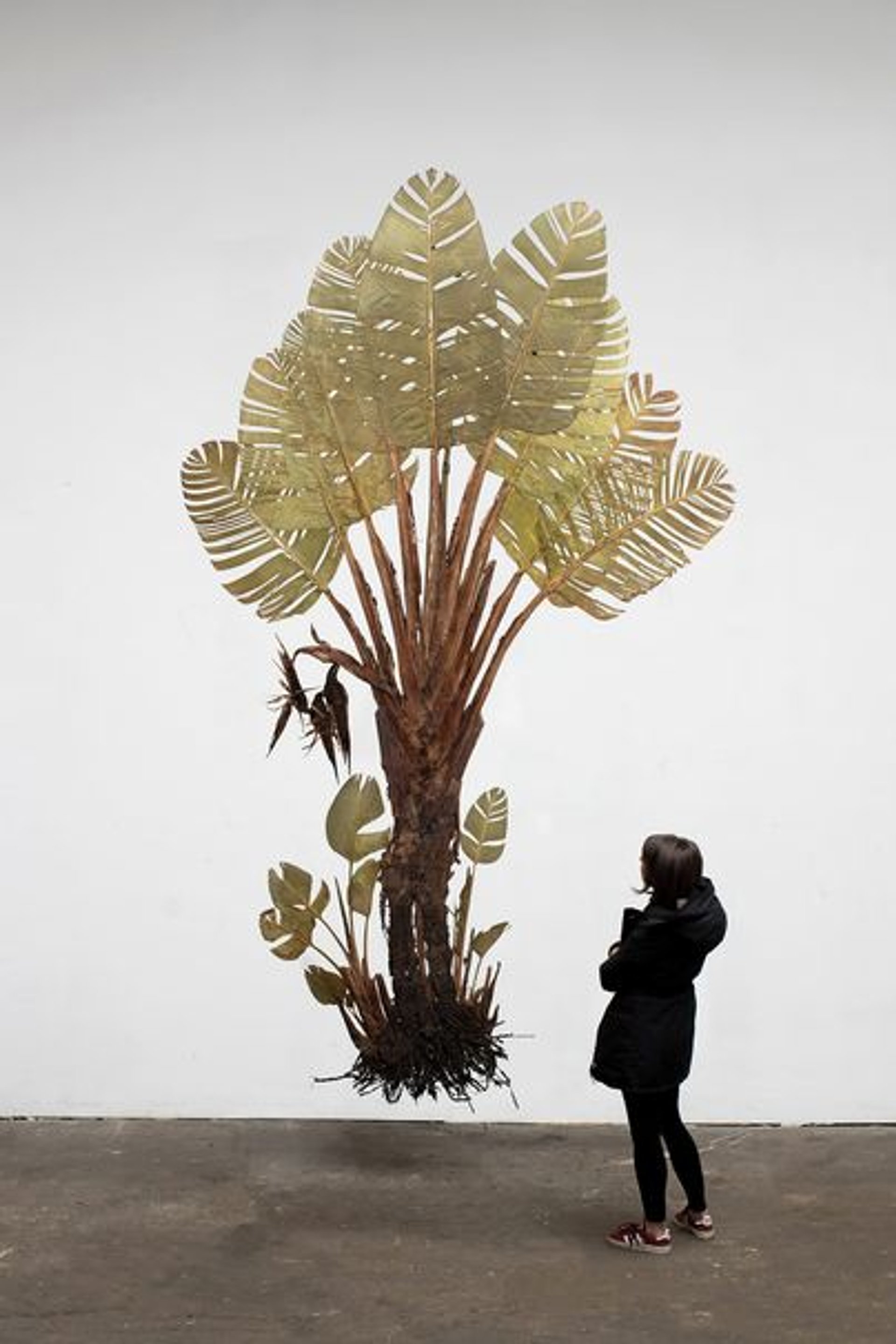 The name is a thread running through Bismarck’s exhibition. Another large installation, I Like the Flowers, features a roomful of giant pressed palm trees suspended from the ceiling, including a species from Madagascar known as the Bismarck Palm. In their ornamental, one-dimensional beauty, the trees give the illusion of fragility (they are in fact mounted on steel). An abstract painting on a nine-meter by 12-meter cloth showing stripes of movement on the surface of the Bismarck Sea billows gently from the ceiling. A photograph shows the cloth floating on the waves off Papua New Guinea.