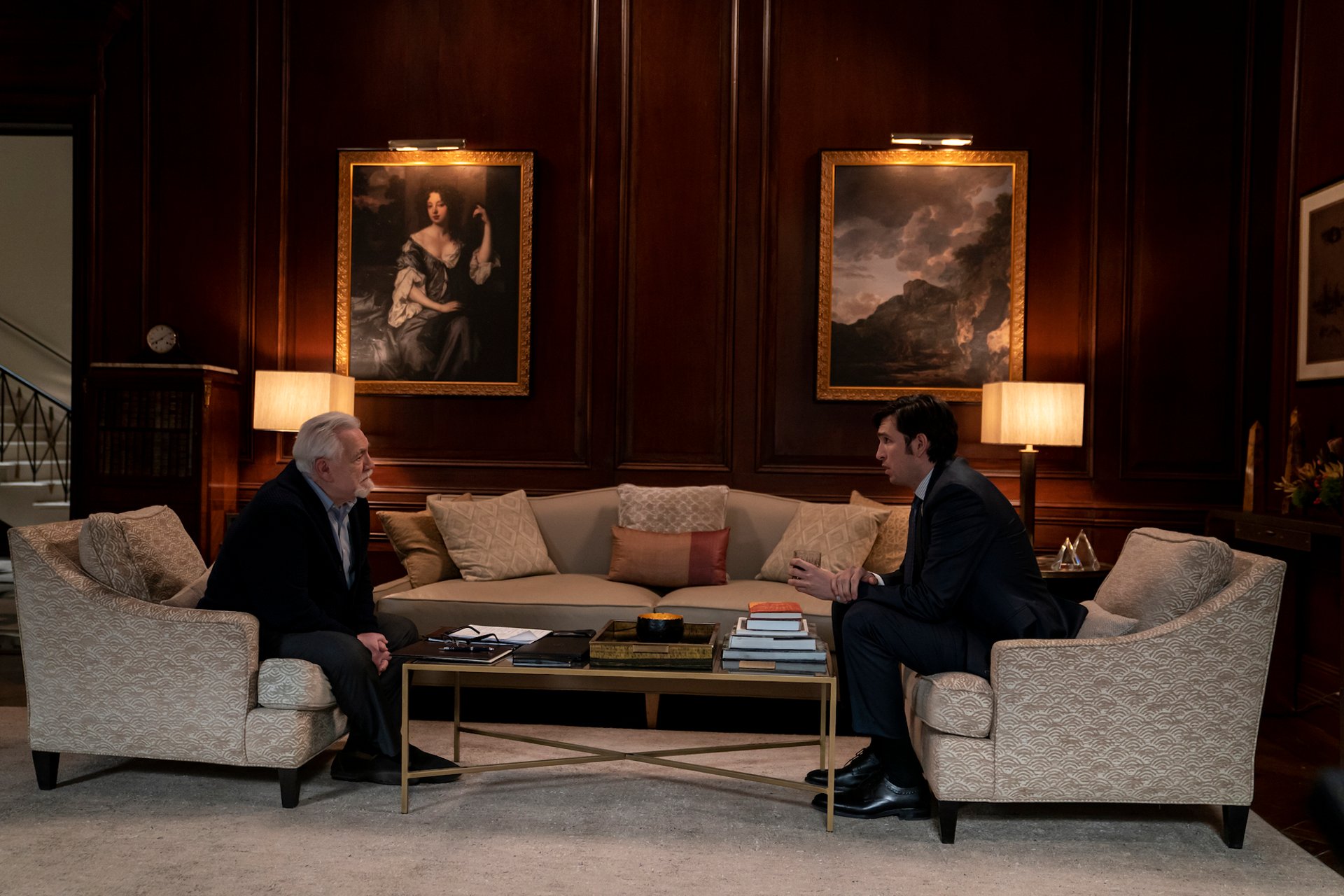 Logan Roy (Brian Cox) and Greg Hirsch (Nicholas Braun) sitting before two apparent Old Master paintings in a scene from the fourth episode of season three of HBO's Succession Macall B. Polay/HBO