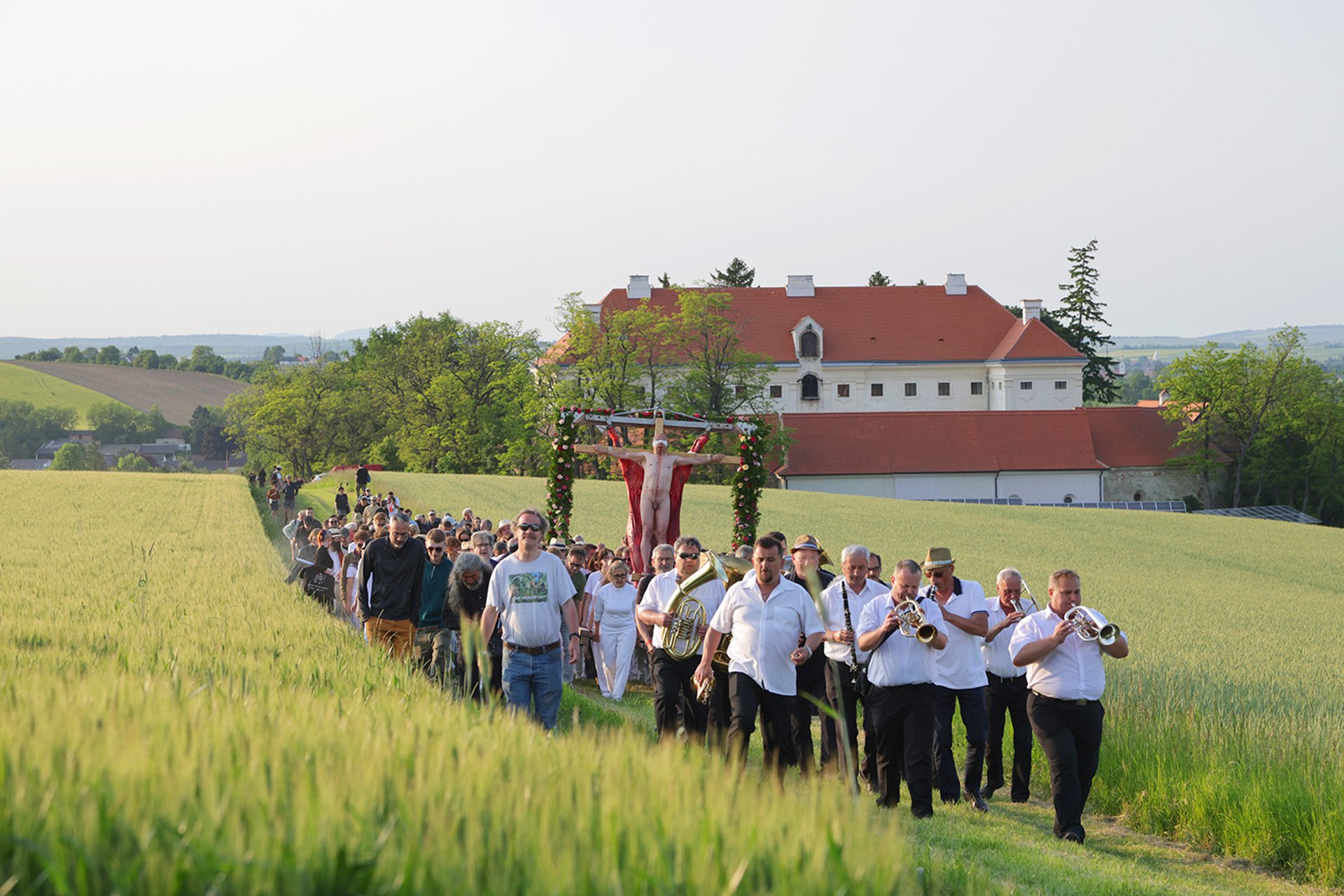 The peaceful setting surrounded with verdant wheat fields stood in stark contrast to the all-day performance, with its dissonant music, banging of gongs, drums and clanging bells accompanying scenes of gore and general mayhem. Nitsch himself left precise instructions for the day and had composed all the music, including a 287-page score.