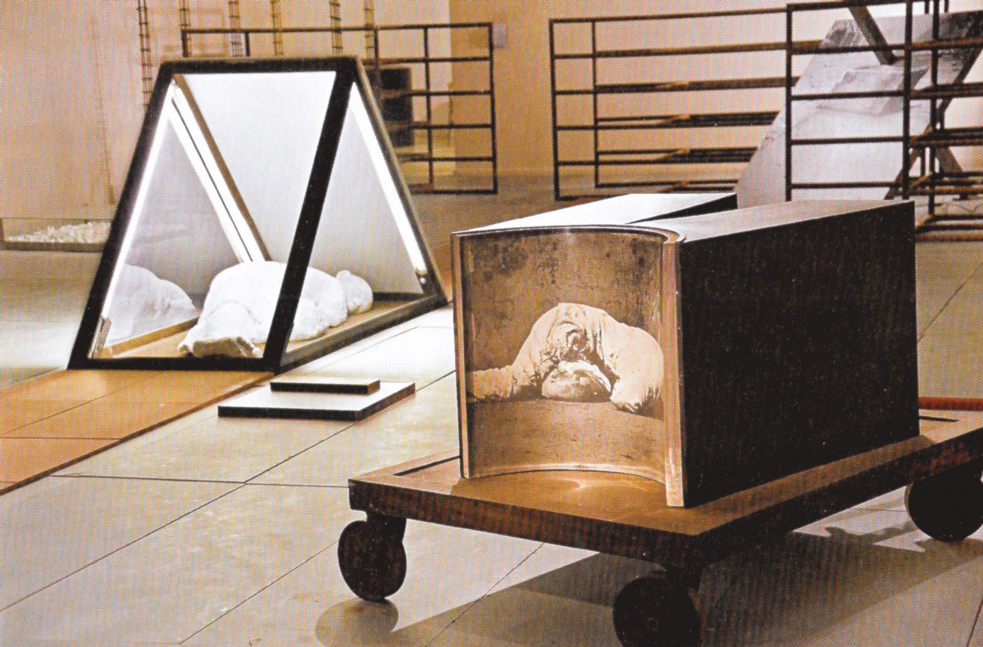 Sundaram’s colossal project Memorial, first created in 1993 and elaborated upon over several years, emerged in this vein as a call “against forgetting”. This immersive installation— exhibited as part of Century City at Tate Modern, London, in 2001 in the chapter Bombay / Mumbai: 1992-2001 co-curated by Geeta Kapur and Ashish Rajadhyaksha—and once again on view in the museum’s Tanks section, is reminiscent of an archeological ruin, burial and crime scene. It includes a silhouette of steel barriers and a gateway made of luggage—marking the destruction of the Babri Mosque in Ayodhya in 1992 by right-wing Hindu mobs, a cataclysmic event beyond the scope of singular representation—and a news photograph by Hoshi Jal for the Times of India in January 1993 of an unknown Bombay riot victim slumped in a street corner.