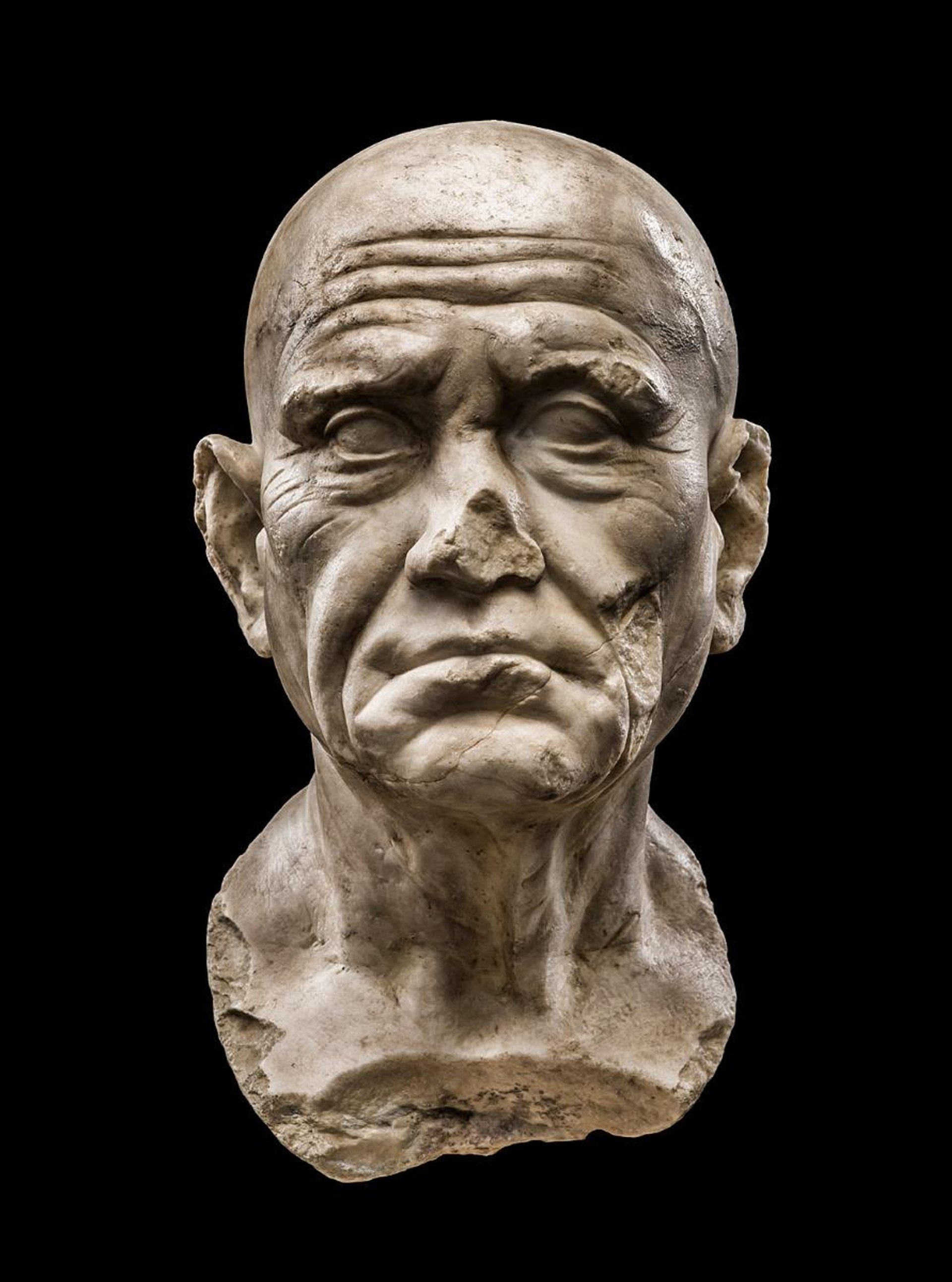 This remarkable marble sculpture—possibly of a venerable Roman senator—is far removed from the idealised portrayals of gods and heroes we associate with classical art. Instead it combines an unsparing representation of the ravages of age—the furrowed brow, sagging cheeks, deep worry lines around the eyes—with a bearing suggesting extraordinary strength, energy and purpose.