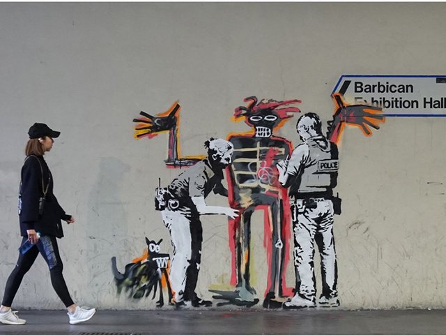 Cut & Run will focus on the stencils the artist uses to create his works, which are often spray painted on walls around the world, including damaged buildings in Ukraine, a carpark in Los Angeles, the exterior of an old prison in Reading, the separating wall in Bethlehem and inside a London tube train. The exhibition will also feature the Union Flag stab vest that Banksy made for the pop star Stormzy and paintings such as Basquiat being stop and searched (2017), a version of which was painted on the walls outside a Jean-Michel Basquiat exhibition at London’s Barbican Gallery in 2017.