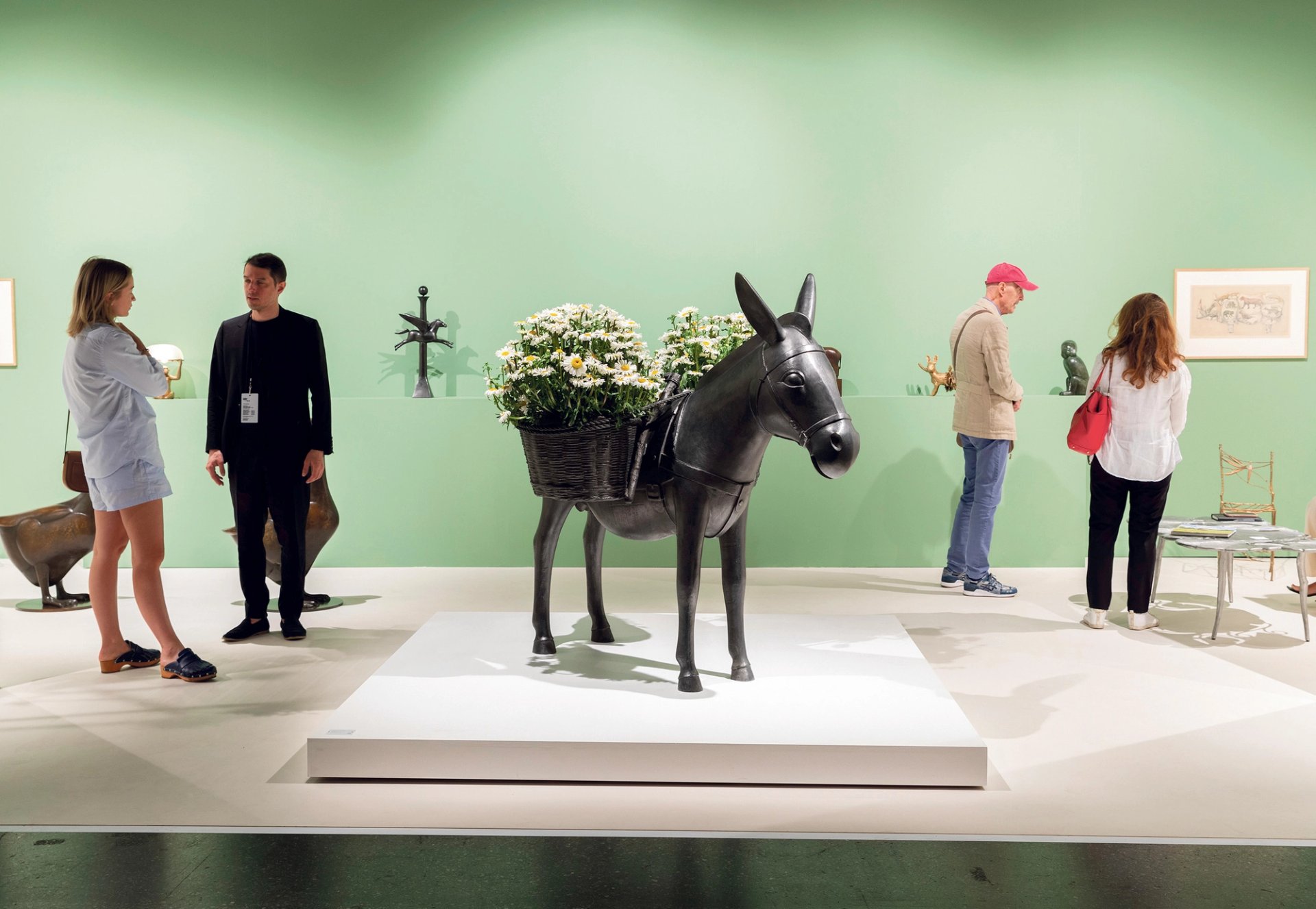 Little donkey, little donkey, why do you cost so much? A collector might be tempted to emit a mournful bray when they learn the price of François-Xavier Lalanne’s sculpture: between €5m and €6m. As a student at the Académie Julian in Paris in the 1940s, Lalanne met the Surrealists Man Ray, Max Ernst and Marcel Duchamp. He and his wife, Claude Lalanne, later began making furniture together as Les Lalanne. Versed in the space-age monochrome Modernism of the era, they incorporated the influence of their Surrealist friends, creating functional yet fantastical design pieces. This donkey sculpture has saddlebags that double as planters, currently potted with daisies.