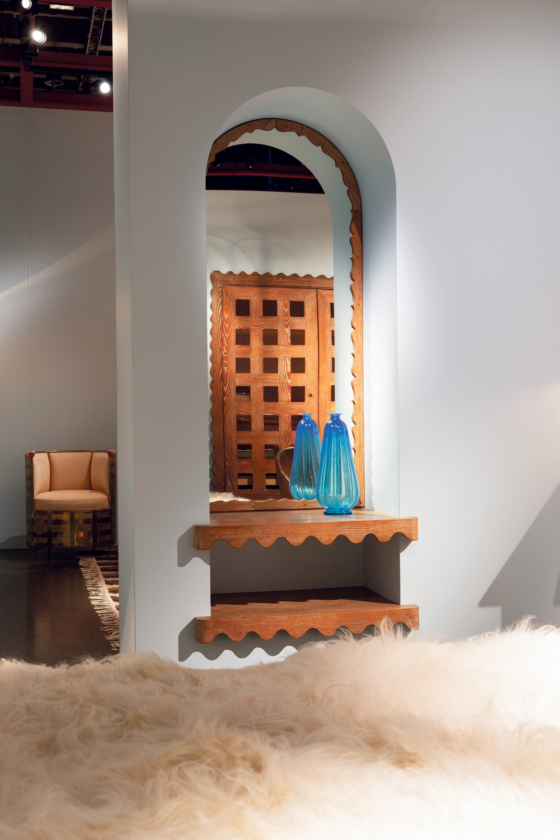 Everything in Morentz Gallery’s stand at Design Miami/Basel originates from a country house nestled in the woods of Arcisate, near Lake Como. The building and all its interiors were designed in 1936 by the Milanese architect and designer Paolo Buffa for his daughter. Lamps, beds, storage units and night stands were all designed to complement each other. Buffa favoured rarefied materials, as in the carved horse chestnut wooden shelves and undulating inlays.