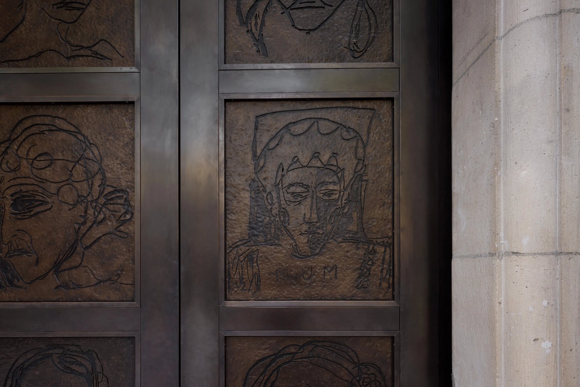 The portraits now visible on the panels of the NPG’s doors were cast in bronze at an east London foundry which Emin often uses. Originally painted in acrylic on paper, Emin’s drawings were then transcribed onto the bronze panels—although the artist’s finger and thumbprints remain visible in metalwork.