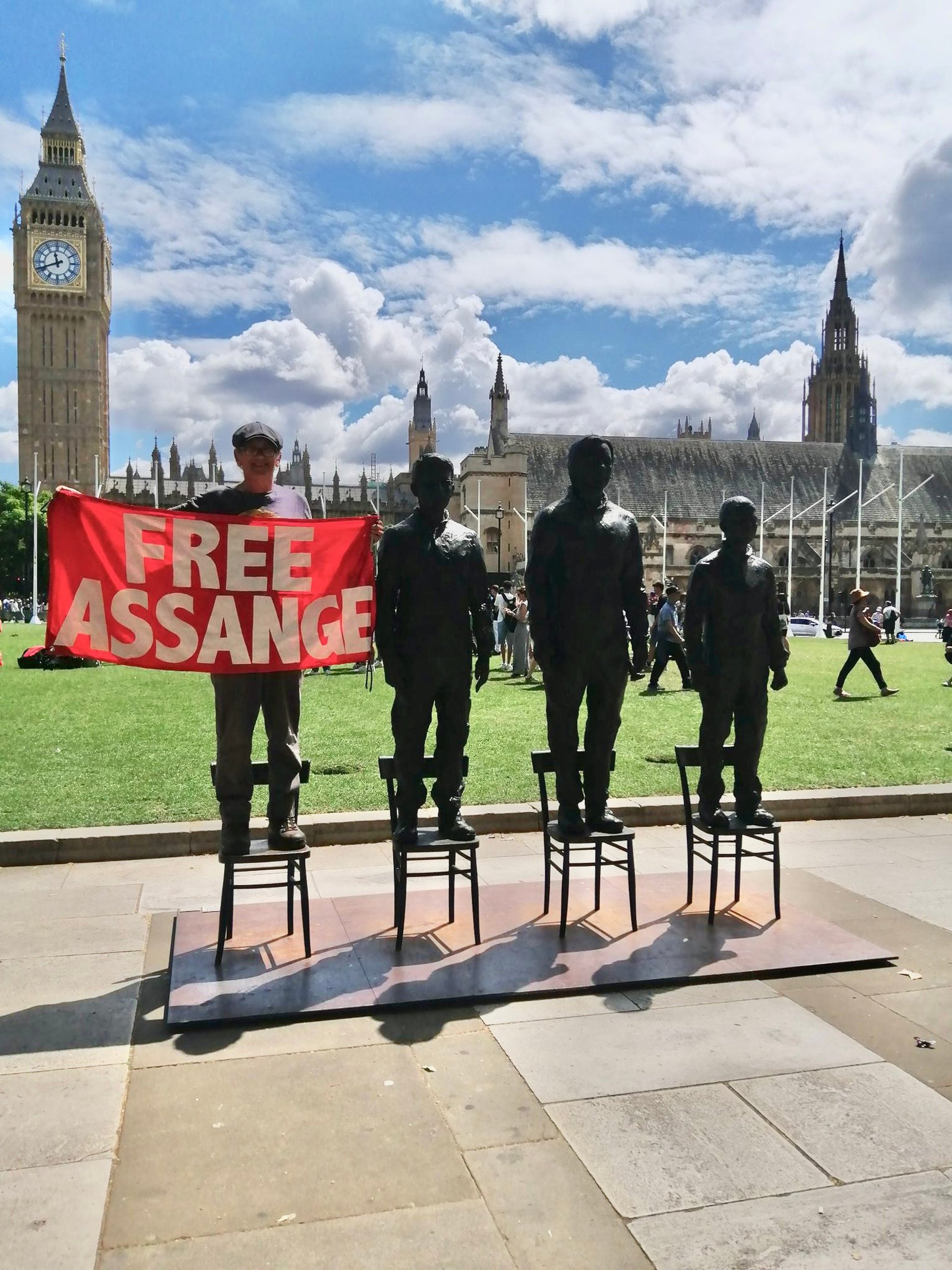 An empty chair stood beside the three effigies in Parliament Square, inviting members of the public to stand alongside the three controversial figures. “As an artist I feel I have the duty to defend freedom of speech and the right to know. That is why I have created an empty chair which allows us to stand taller and raise ourselves. It changes our perspective and allows us to look at what we are not shown and what is hidden,” says Dormino in a statement.