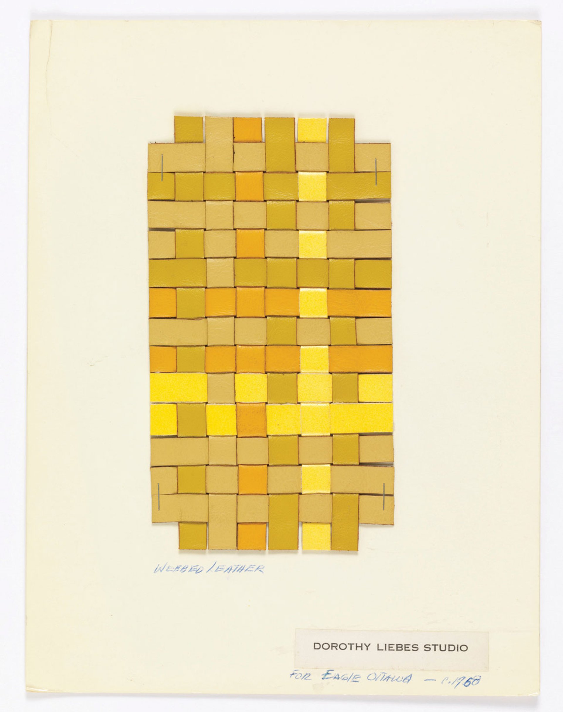 Liebes had originally planned to be an artist, explains the exhibition’s co-curator Alexa Griffith Winton, and “her understanding of colour emerged from that”. The California native collaborated with fashion designers, as well as architects, and while a 1958 woven-leather sample card—in various shades of yellow—is a study for a leather pattern suitable for shoes and handbags, its striking grid shows an artist’s eye at work.