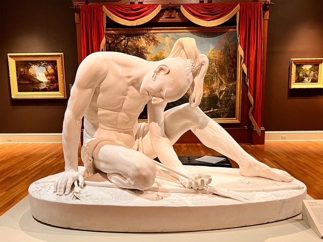 Created around 1850 by the UK-born artist Peter Stephenson, then just 26 years old, the sculpture went on view in Boston, US, notable for being the first life-sized figure made entirely of American marble, mined in the state of Vermont. The native American population had, at that point, largely been displaced west of the Mississippi river, which may account for the sympathetic portrayal of an enemy on the edge of death and no longer a threat.
